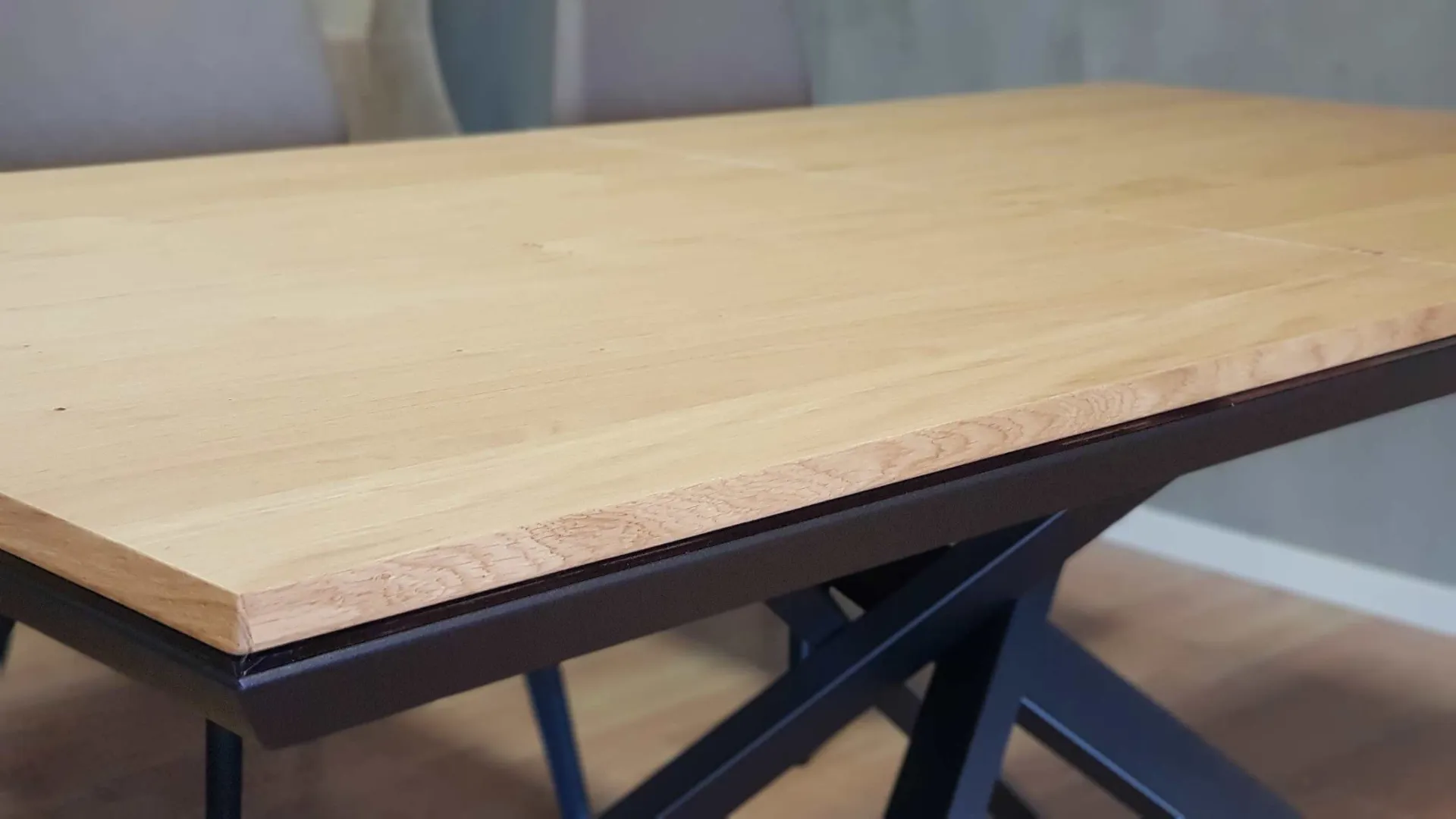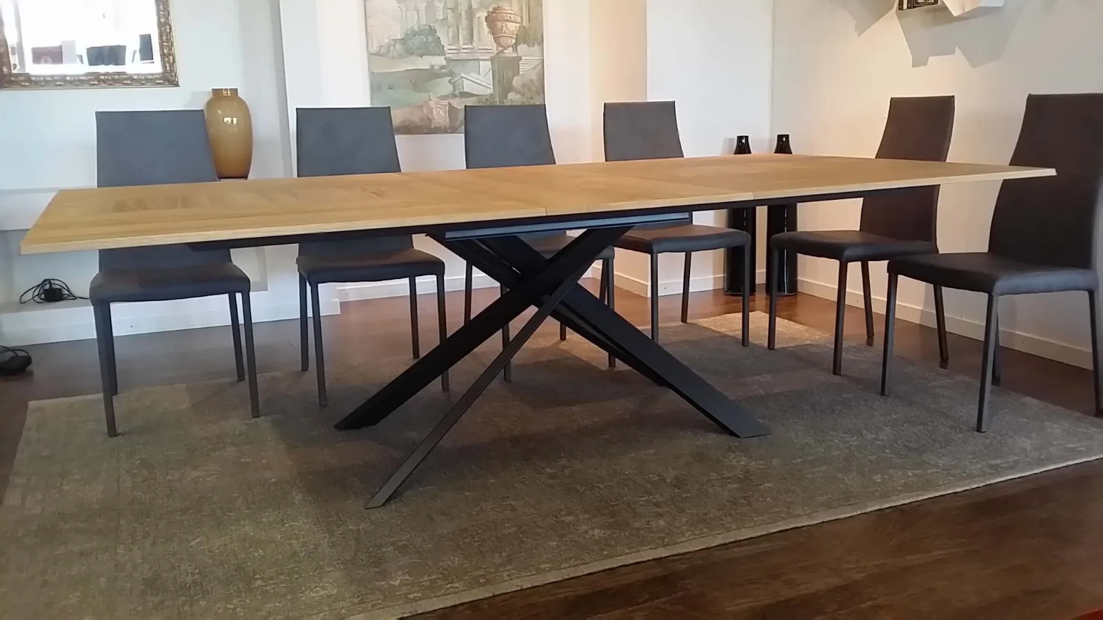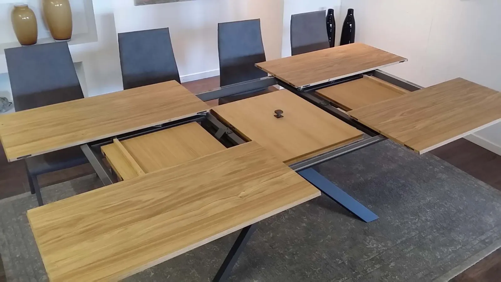 Allungabile e allargabile con basamento incrociato in metallo, piani e allunghe in legno