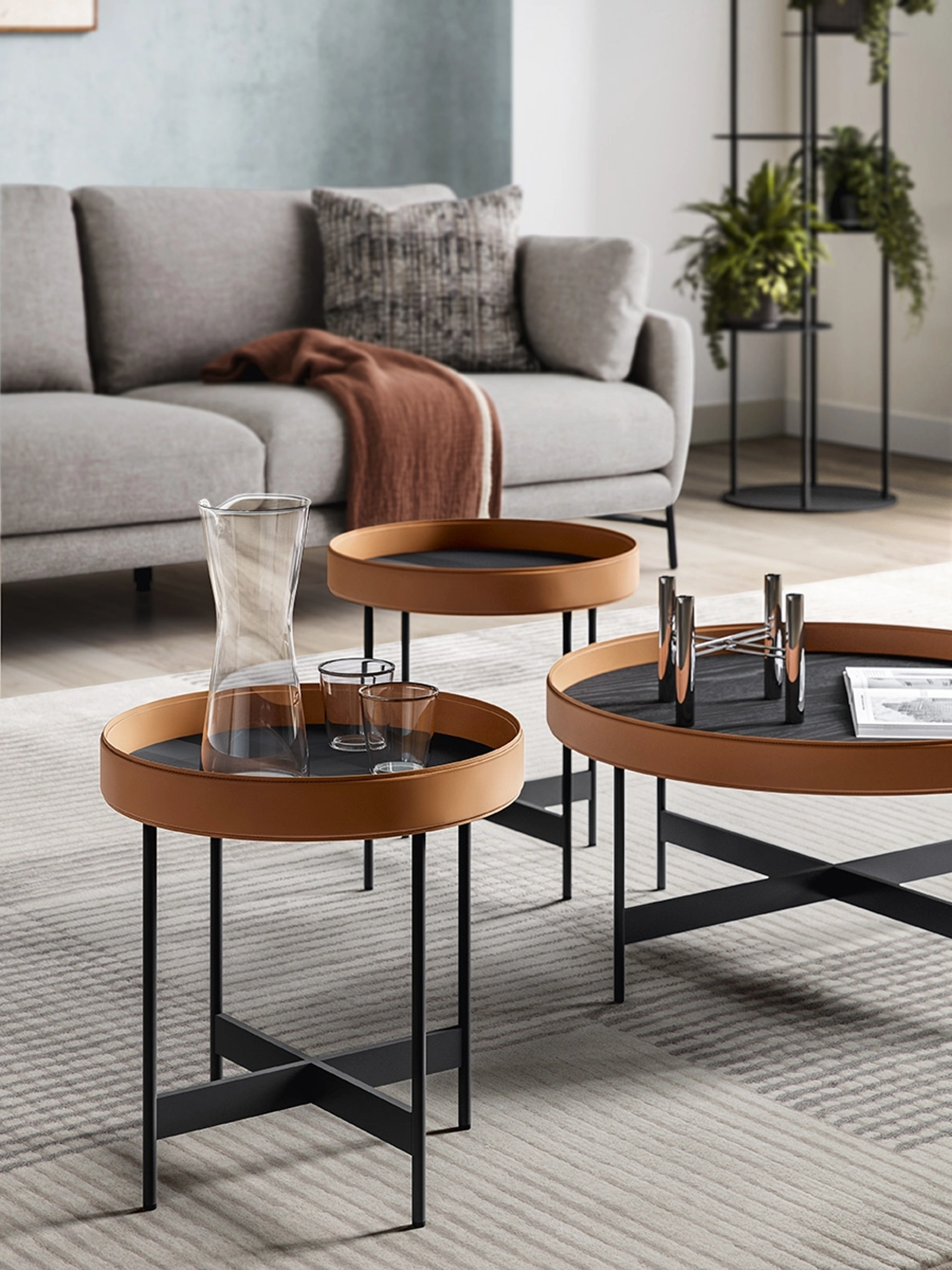 Il tavolino Arena CS5118-P incarna una sintesi perfetta di design e funzionalità avanzata, distinguendosi per la sua costruzione meticolosa. La struttura portante è realizzata in metallo opaco, trattato con una doppia verniciatura a polveri che ne garantisce durabilità e una finitura esteticamente raffinata. Il piano circolare, in legno tinto, è elegantemente avvolto da una fascia in cuoio rigenerato, un dettaglio che non solo impreziosisce l'estetica ma crea anche un'area contenitiva discreta e funzionale. Questo elemento distintivo, ispirato all'alta sartoria, eleva il tavolino a un oggetto di design versatile, capace di offrire una superficie d'appoggio stabile e, nella sua configurazione più pratica, un comodo vassoio amovibile. L'eccellenza costruttiva è evidente nella selezione dei componenti, che assicura solidità e un'estetica armoniosa, rendendolo un complemento d'arredo di pregio. Ogni dettaglio è pensato per ottimizzare l'esperienza d'uso e l'integrazione stilistica in ambienti contemporanei.