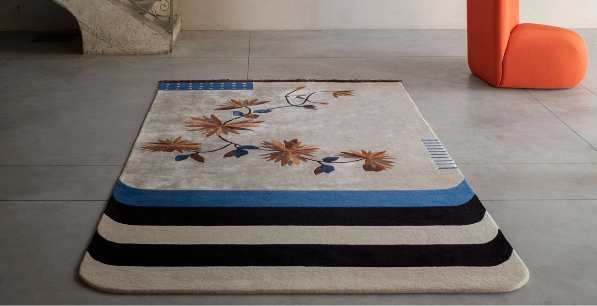 Scopri la nostra serie di complementi moderni e tappeti come il modello Kyu in foto