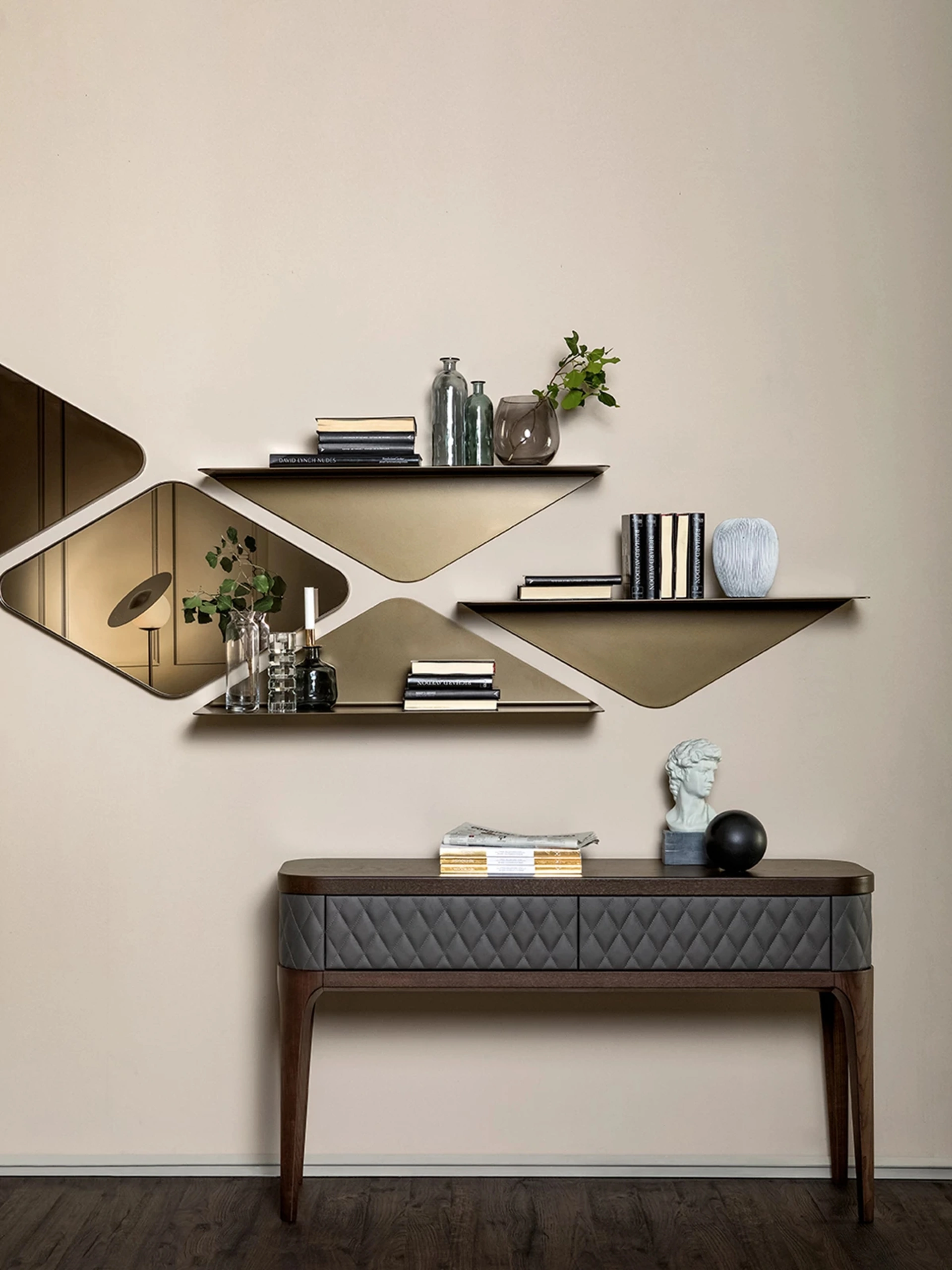 Le Mensole Matrix di Tonin Casa rappresentano un raffinato complemento d'arredo, espressione dell'avanguardia nel design contemporaneo. La loro struttura è realizzate in metallo con un distintivo specchio romboidale, pensate per arricchire gli ambienti con stile e funzionalità superiori. Queste mensole sono progettate per offrire soluzioni creative e versatili per l'organizzazione e la valorizzazione degli spazi, integrandosi armoniosamente in contesti moderni. L'ingegneria alla base del prodotto assicura un'elevata modularità e ampie opzioni di personalizzazione, per adattarsi a ogni esigenza progettuale.