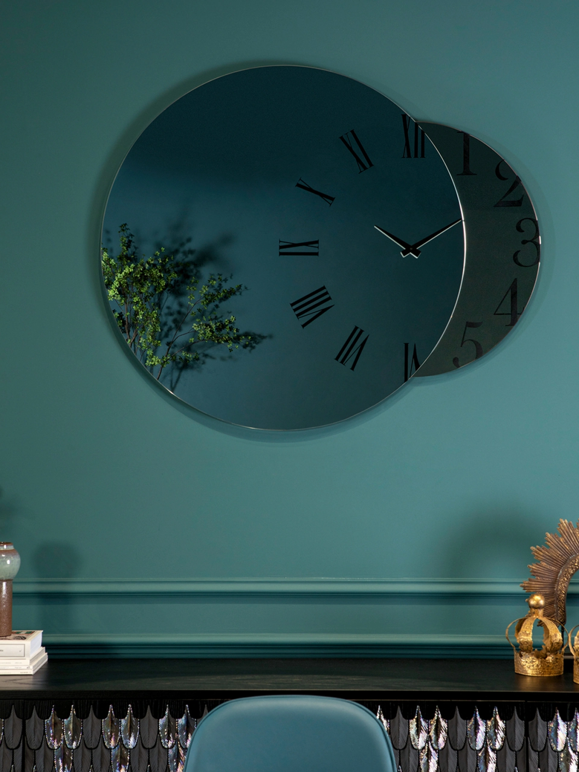 Disponibile presso il nostro showroom Rusconi Arredamenti s.r.l. a Cirimido, l'Orologio Fusion di Tonin Casa è un complemento d'arredo che unisce arte e funzionalità. Vi invitiamo a scoprire dal vivo questo pezzo distintivo, dove due cerchi sovrapposti creano un gioco visivo unico. Osservate come numeri arabi e romani si fondono armoniosamente, e come lo specchio si integra nell'orologio, il tutto esaltato dalle preziose finiture in cristallo bronzo e fumè. Siamo il punto di riferimento per l'arredamento di design, con un servizio dedicato ai clienti di Cirimido e della provincia di Como, facilmente raggiungibile per una visita esplorativa.