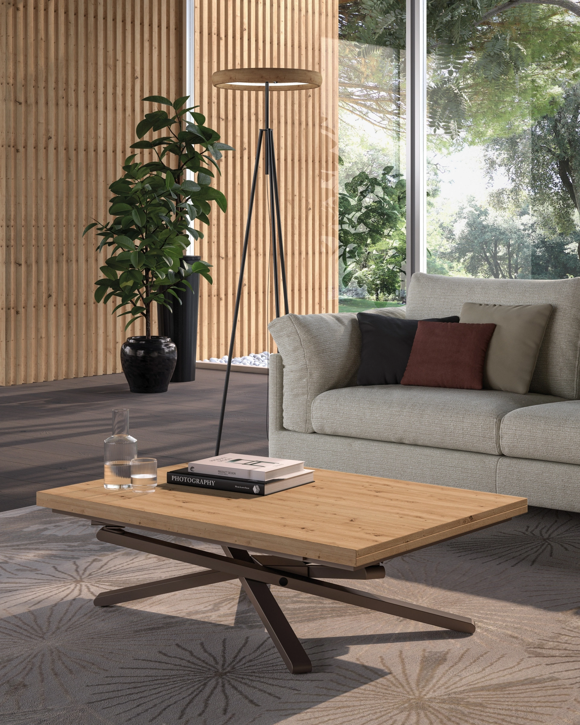 Il tavolino trasformabile SHAZAM di Easyline si distingue per la sua ingegneria avanzata e le linee scultoree, offrendo una soluzione d'arredo altamente funzionale. Con un meccanismo brevettato, questo versatile coffee table si converte senza sforzo in un tavolo da pranzo spazioso. Il piano è finemente realizzato in eco-legno, mentre la solida base in metallo ne esalta la stabilità e il design distintivo. Un'eccellenza che coniuga design innovativo e materiali selezionati per prestazioni superiori e un'estetica raffinata.