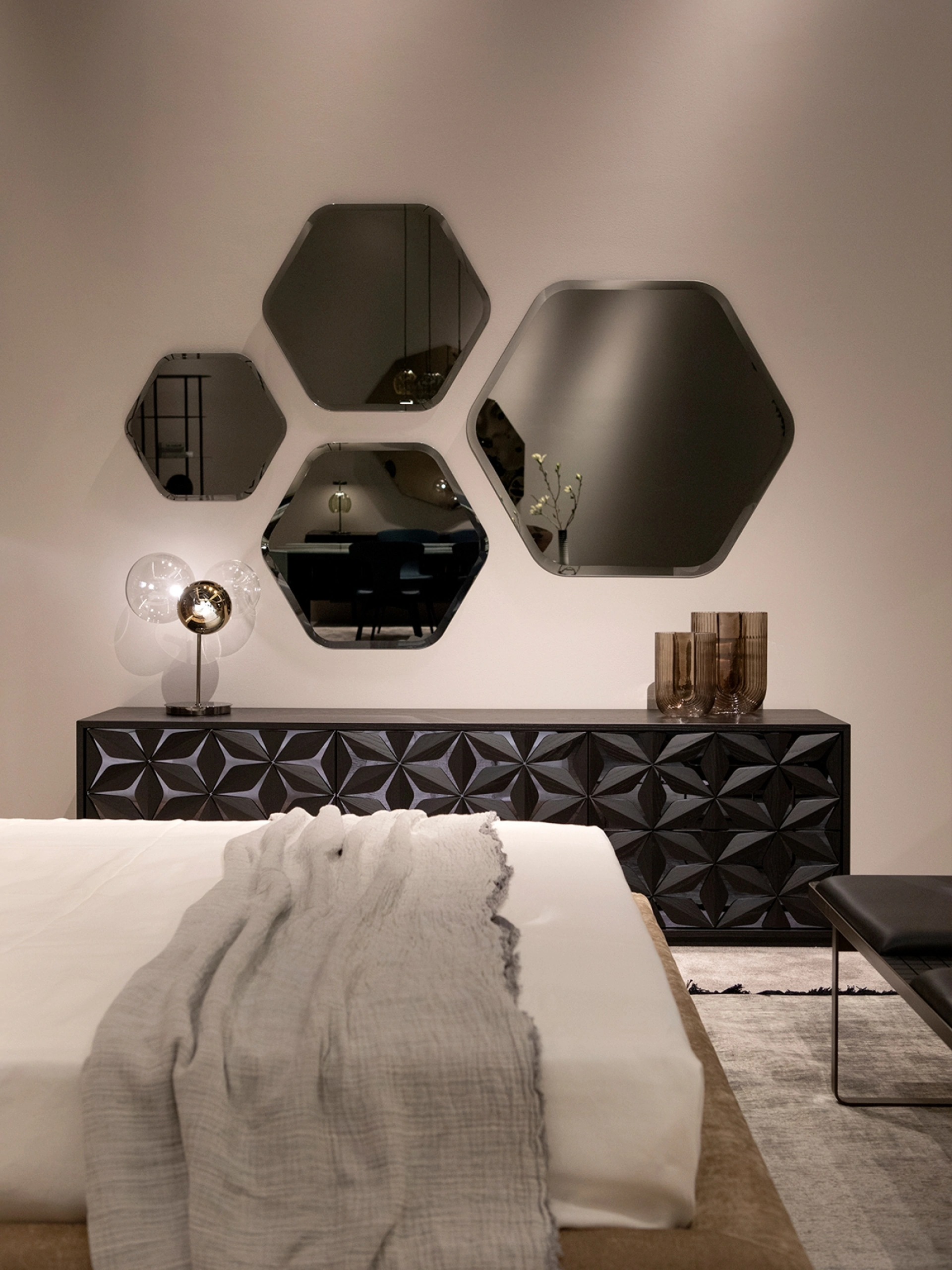 Scopri lo Specchio Kaleidos di Tonin Casa, un elegante trittico di specchi esagonali con bisello disponibile in finiture argentate, bronzate o fumè. Offriamo un servizio di consegna e installazione professionale, estendendo la nostra competenza in arredamento e posa in opera su misura in diverse aree, tra cui Legnano, Rho e Novara. Le forme geometriche armoniose di Kaleidos si integrano perfettamente in ogni ambiente, garantendo un tocco di design e funzionalità. Per la tua tranquillità, ogni acquisto è accompagnato da un'assistenza post-vendita dedicata e una garanzia completa, pensate per assicurare la tua piena soddisfazione e la durabilità del prodotto nel tempo.