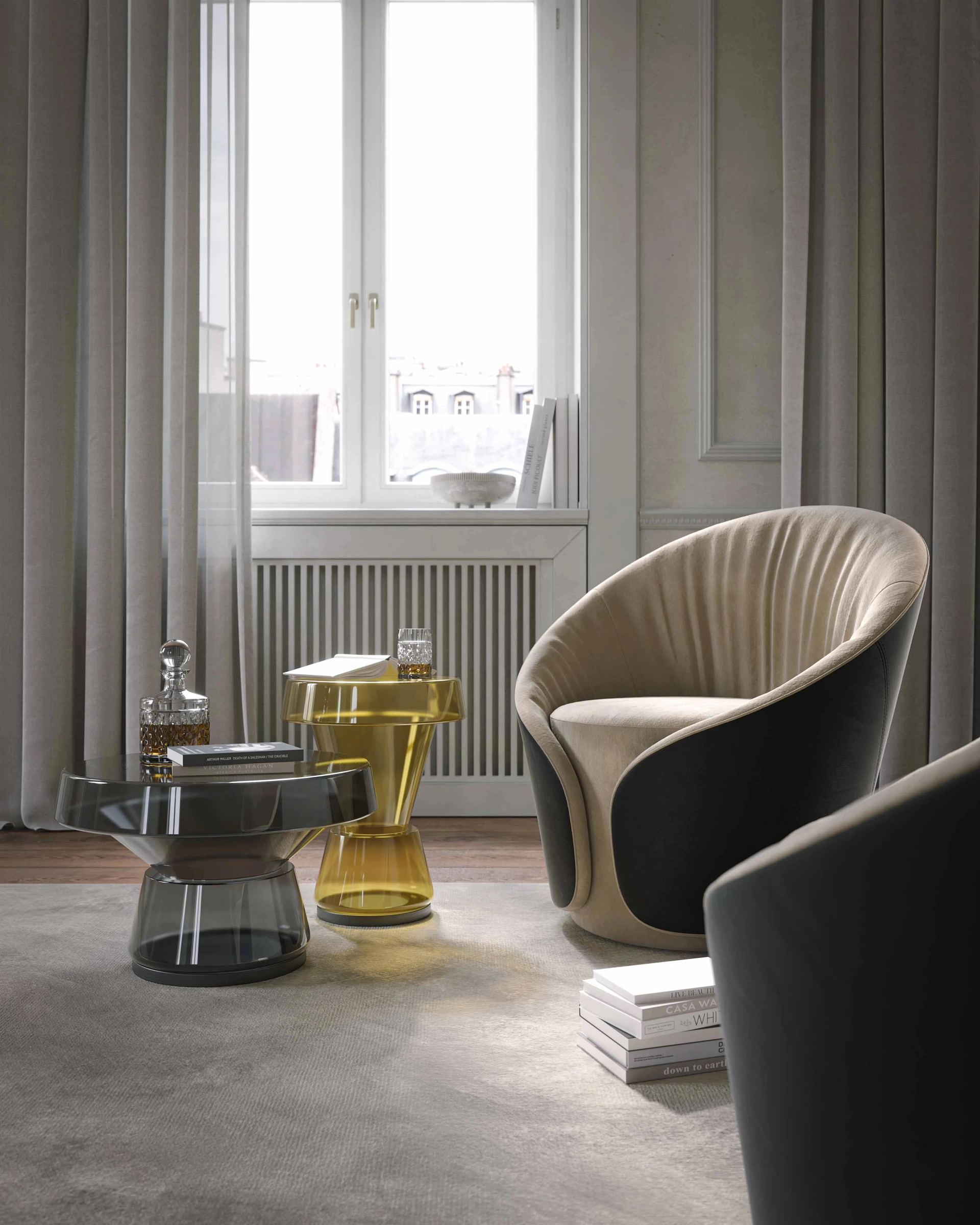 Il Tavolino Giudecca di Tonin Casa si distingue per la sua estetica raffinata e la costruzione artigianale. Questo elemento d'arredo, ideale per spazi contemporanei, è sapientemente realizzato in vetro soffiato a bocca, disponibile nelle suggestive tonalità ambra e fumé. La sua duplice funzionalità lo rende perfetto sia come tavolino che come pratico servetto. La trasparenza del vetro, unita alle sue colorazioni, genera un'intrigante interazione di luci e riflessi, valorizzando l'ambiente. La stabilità è garantita da una solida base in legno con finitura laccata nero opaco, che ne esalta il contrasto materico. Per un approfondimento sulle specifiche tecniche e le opzioni di finitura, invitiamo a consultare la documentazione dettagliata del prodotto.
