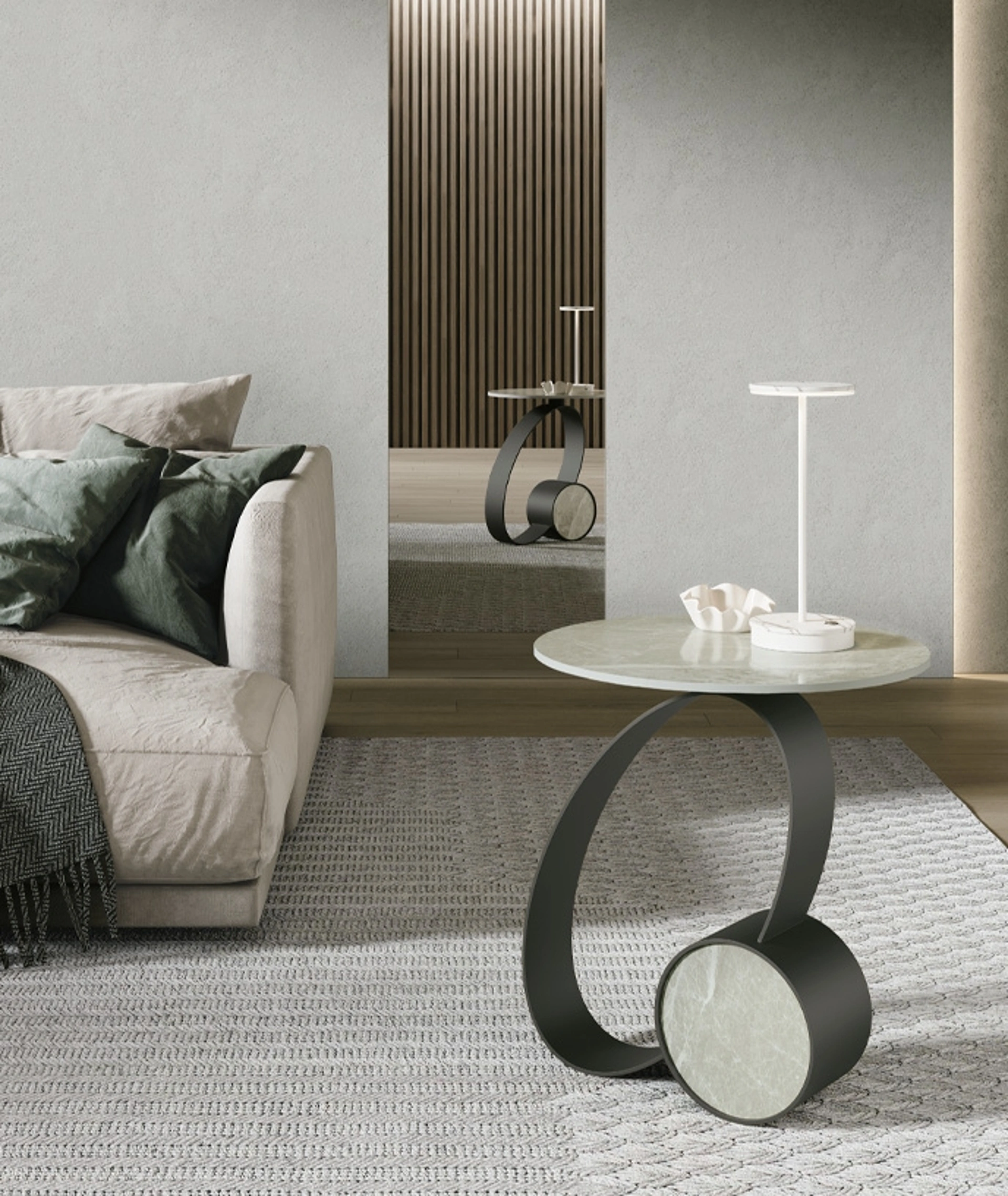 Questo tavolino di design, parte della collezione Target Point, si distingue per la sua costruzione meticolosa e l'ingegnosa fusione di materiali. Presenta una struttura centrale ad anello in metallo verniciato, la quale assolve la funzione di congiunzione strutturale tra il piano superiore rotondo in gres e la base. Le sue geometrie, pur presentando distinzioni, concorrono a un equilibrio compositivo armonioso. La superficie di appoggio è costituita da gres con finitura effetto marmo, mentre la base strutturale è in metallo, conferendo al tavolino una connotazione estetica distintiva e un'aura di raffinatezza ambientale. La priorità nella scelta dei materiali è garanzia di un prodotto longevo e di elevato valore intrinseco. Dettagli sulle finiture sono consultabili.