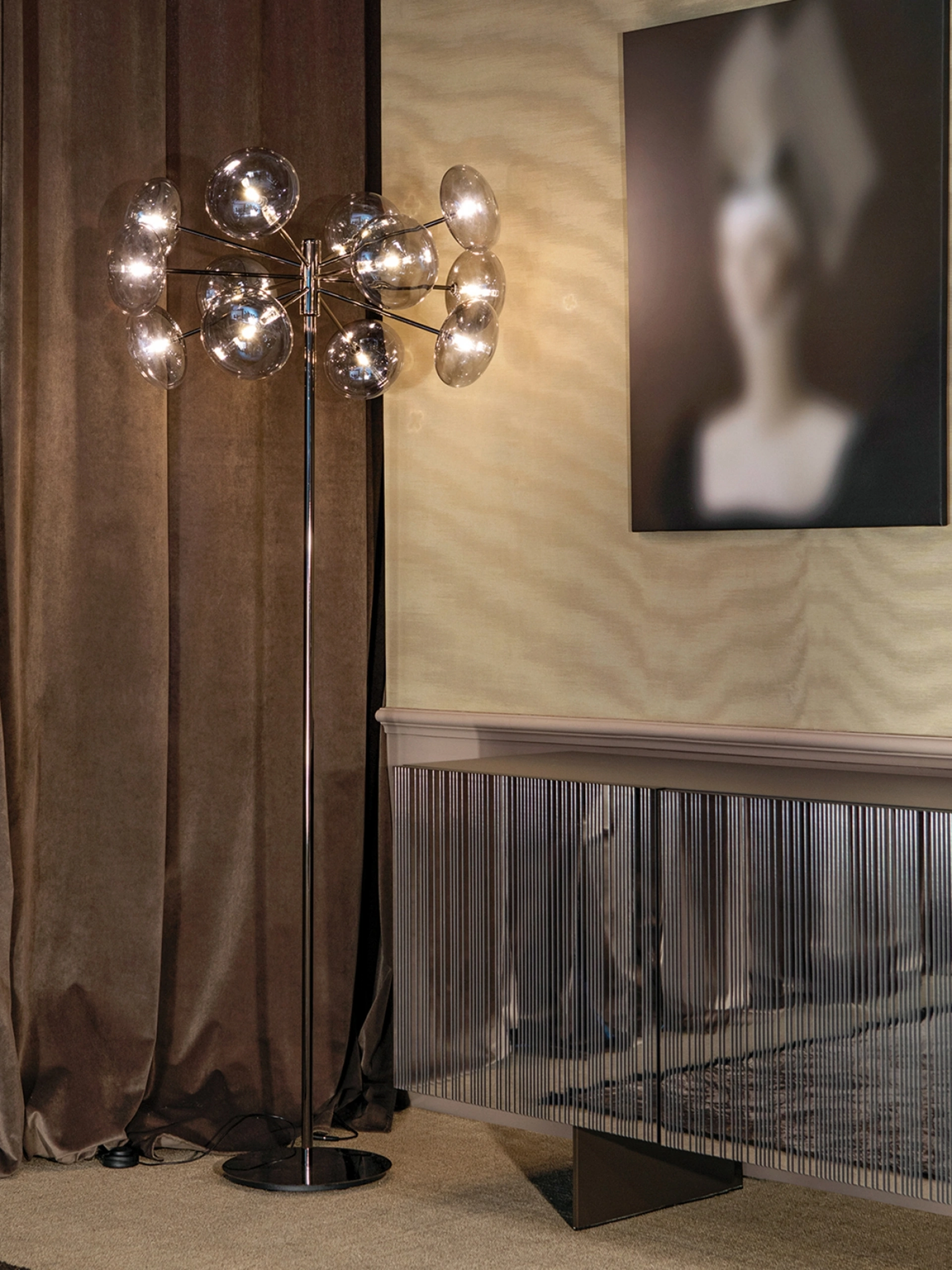 Scopri la lampada da terra Breath di Tonin Casa, un elemento di design che evoca la delicata forma di un soffione, capace di diffondere una luce eterea e suggestiva. Con la sua solida struttura in acciaio verniciato e le dodici eleganti sfere in cristallo soffiato, disponibili in finiture trasparente o fumè, questa lampada si adatta perfettamente a ogni ambiente moderno. Il nostro servizio dedicato assicura una consegna impeccabile e un'installazione professionale in diverse aree, tra cui Milano, Como e Varese, rendendo l'acquisto semplice e senza pensieri. La tua scelta è supportata dalla nostra attenzione al cliente, assicurandoti la massima soddisfazione e un supporto continuo nel tempo.