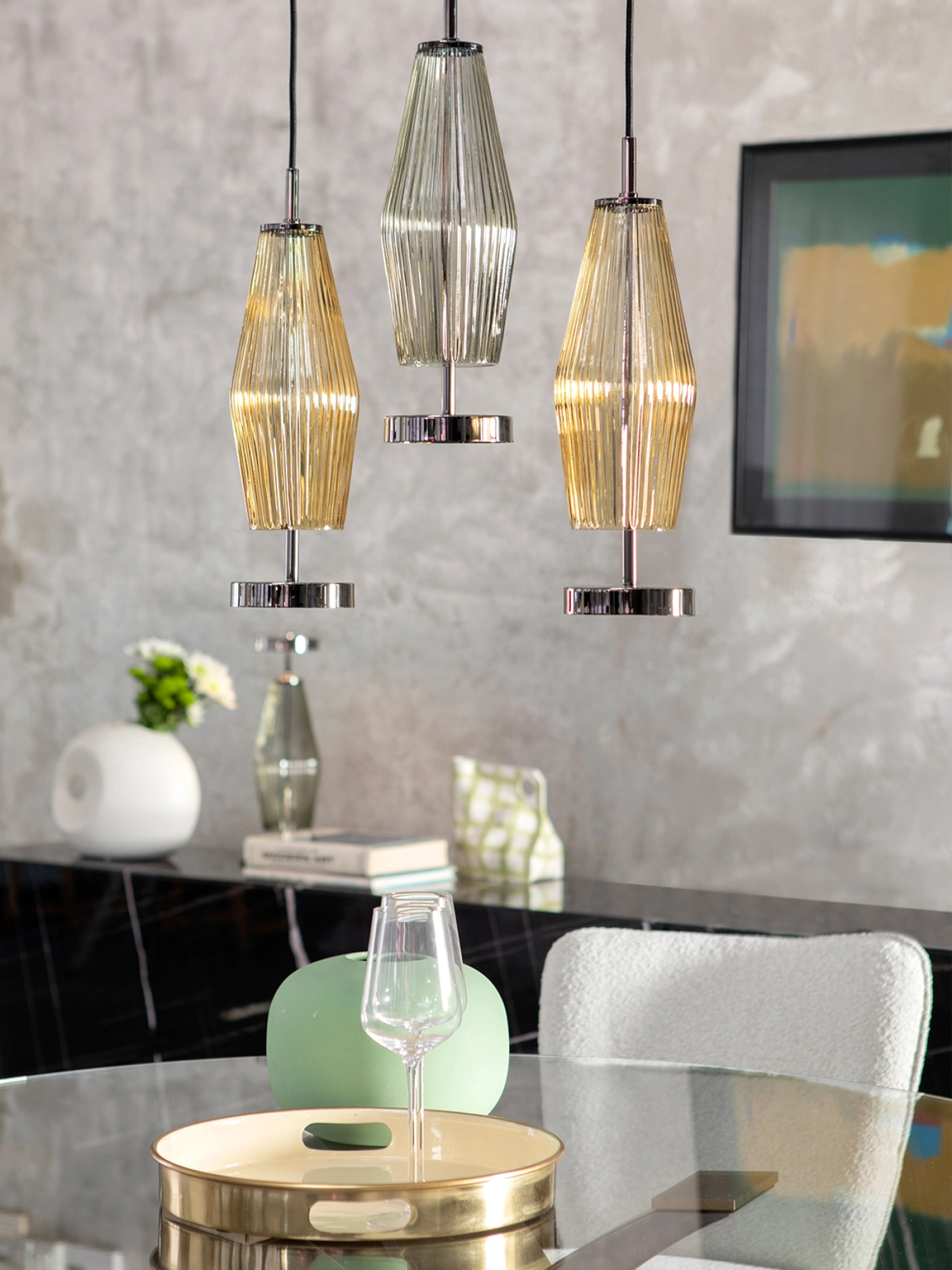La raffinata lampada a sospensione Chic a sospensione, opera di Tonin Casa, si distingue come un pregevole complemento d'arredo luminoso. Le sue forme in cristallo trasparente, impreziosite da sottili motivi geometrici e dettagli in cromo nero o nichel nero, sono il cuore di un'illuminazione calda e coinvolgente. Il vetro soffiato cannettato, proposto nelle varianti ambra o fumé, crea un gioco di riverberi luminosi unico, mentre un filo in tessuto grigio antracite ne completa l'estetica. Questo arredo rappresenta una soluzione ottimale per chi ricerca un connubio tra estetica raffinata e funzionalità avanzata, con una progettazione che assicura durabilità e prestazioni nel tempo.