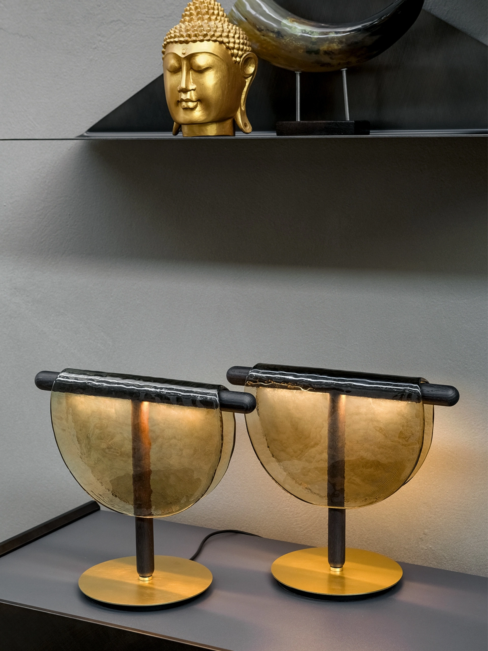 | Materiale: | Vetro in fusione, Legno rovere massiccio, Metallo con finitura oro spazzolato |