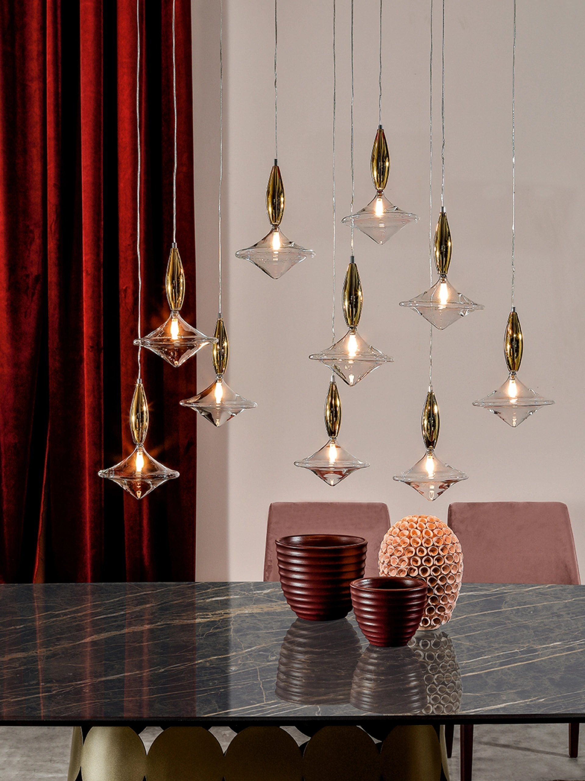 La lampada a sospensione Étoile di Tonin Casa, un capolavoro di design inimitabile, ti aspetta per essere ammirata di persona presso il nostro showroom Rusconi Arredamenti s.r.l. a Cirimido. Questa creazione eccezionale è progettata per impreziosire qualsiasi ambiente, sia come elemento singolo che in composizioni multiple, creando costellazioni luminose da tre fino a venti lampade per un'illuminazione sempre perfetta. Il suo stile distintivo si manifesta in un equilibrio tra effetti luminosi e geometrie pure, grazie all'elegante combinazione di specchio bronzo o oro nella parte superiore e vetro trasparente nella sezione illuminante. Vieni a scoprire l'esclusività di Étoile e lasciati ispirare dalle sue infinite possibilità di personalizzazione.