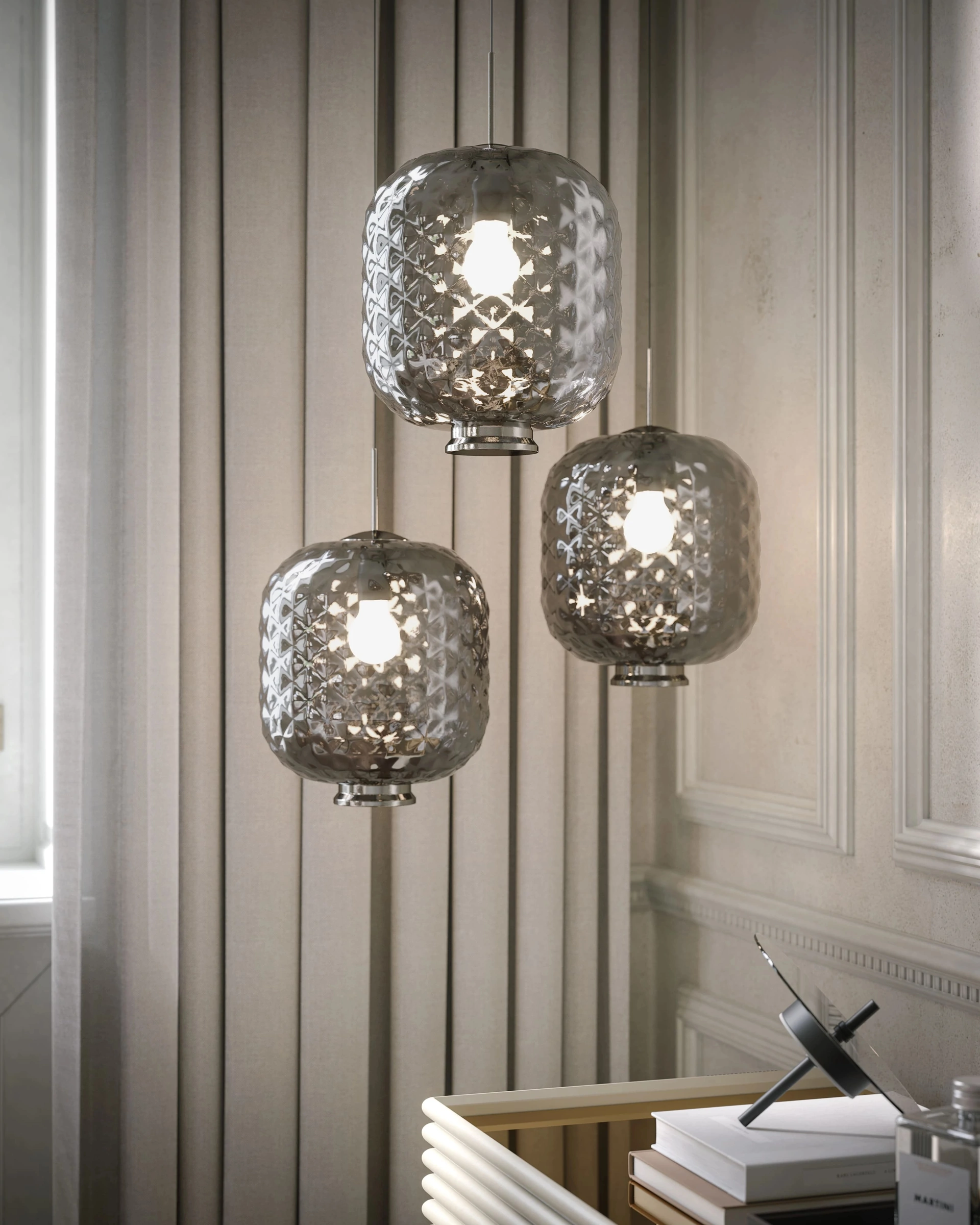 La lampada Lanterna a sospensione di Tonin Casa incarna un'estetica raffinata e un'ingegneria del design avanzata. Realizzata con Vetro fumé soffiato a bocca, presenta una distintiva texture tridimensionale a rombi, frutto di una meticolosa lavorazione artigianale. Questa peculiare superficie non solo impreziosisce visivamente, ma è studiata per modulare la diffusione luminosa, generando giochi di luce e ombre che creano un'atmosfera unica e coinvolgente nell'ambiente. La sua versatilità d'installazione la rende perfetta sia come punto luce a sospensione, sia come elegante elemento da tavolo, adattandosi con fluidità a diverse configurazioni d'arredo. La progettazione intrinseca di questo elemento garantisce una durabilità eccezionale e un mantenimento dello stile inalterato nel tempo, assicurando un valore estetico e funzionale a lungo termine.