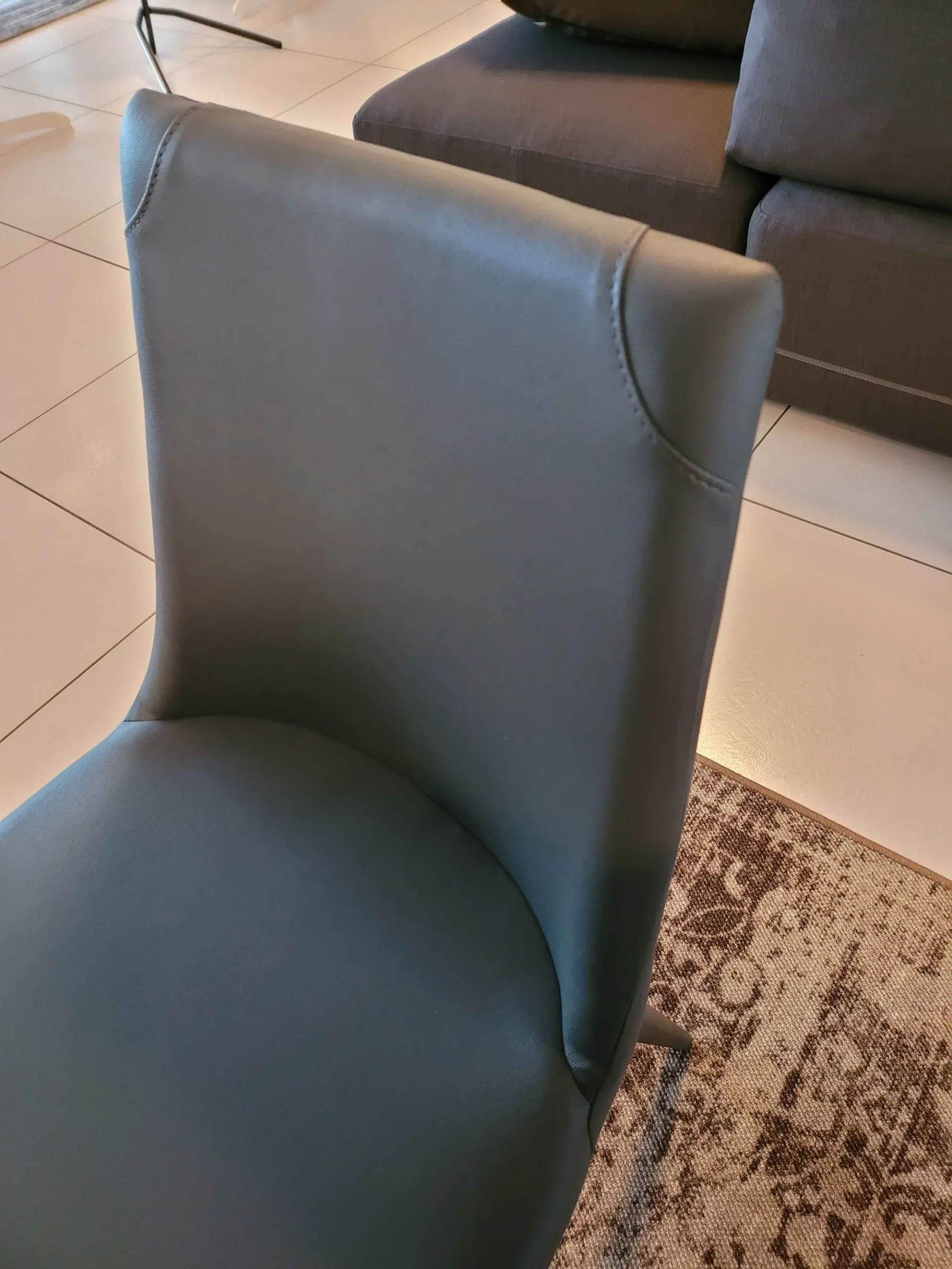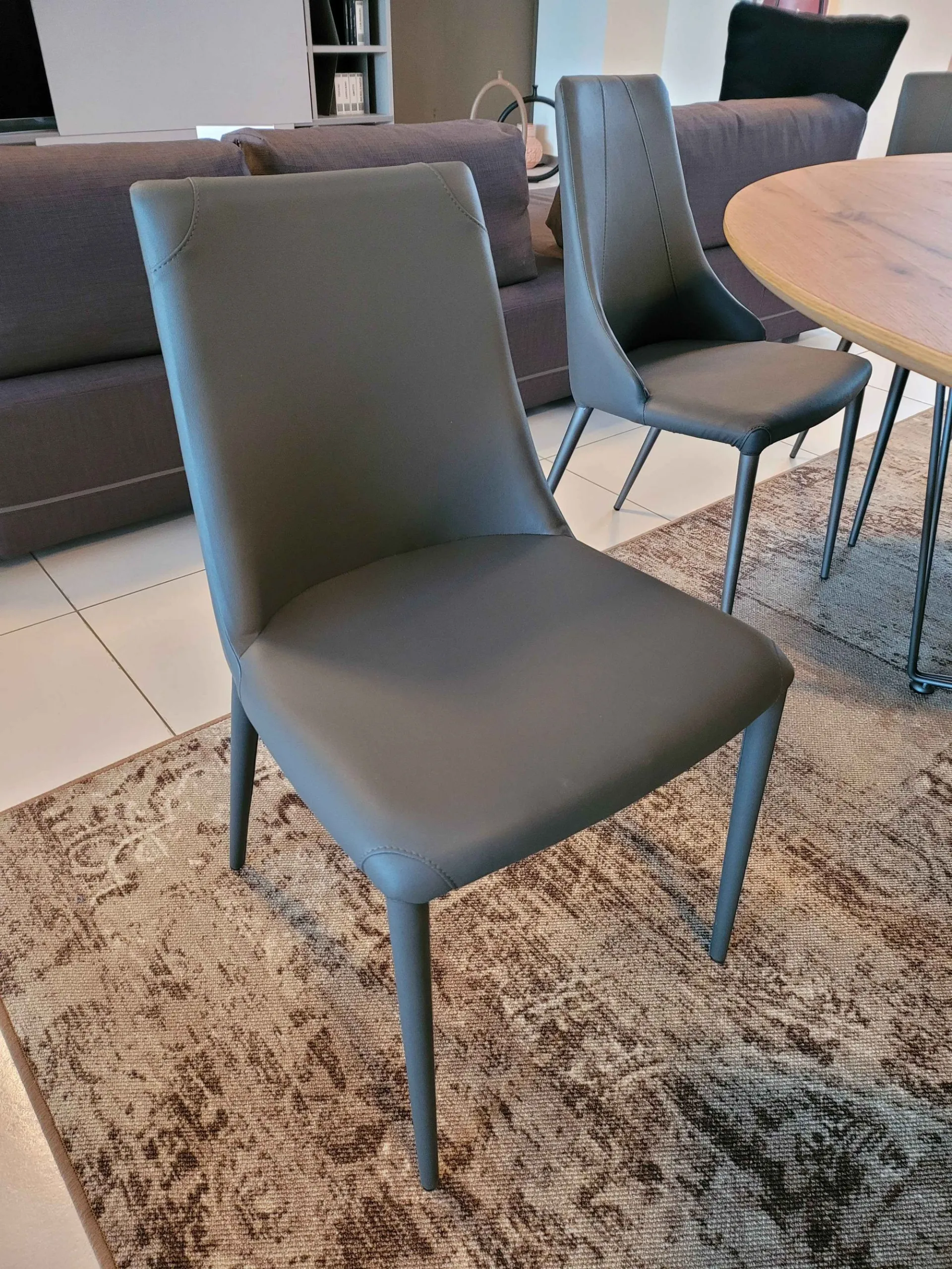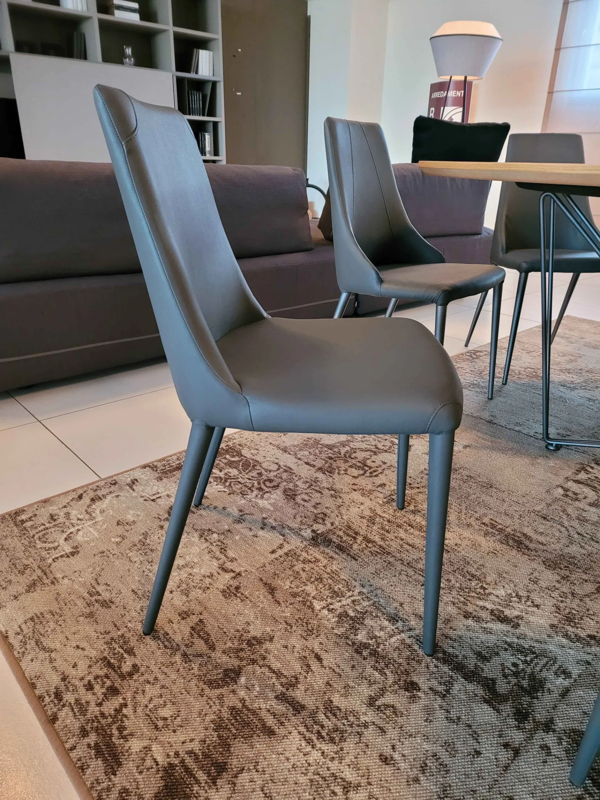 Sedia APEROL con schienale leggermente curvato e dalle linee morbide. Completamente rivestita in ecopelle colore GRAFITE e particolari cuciture in prossimità delle quattro gambe.