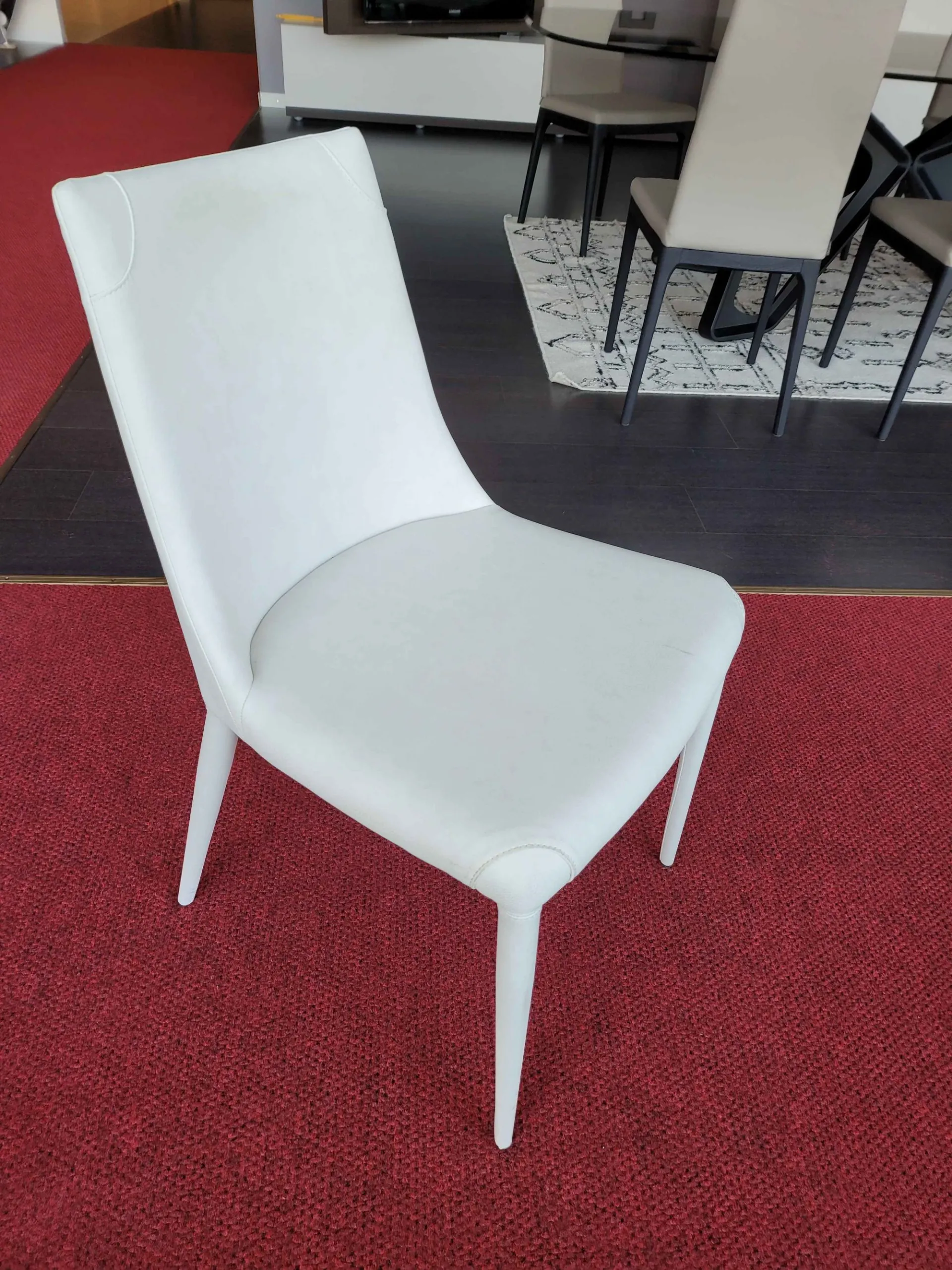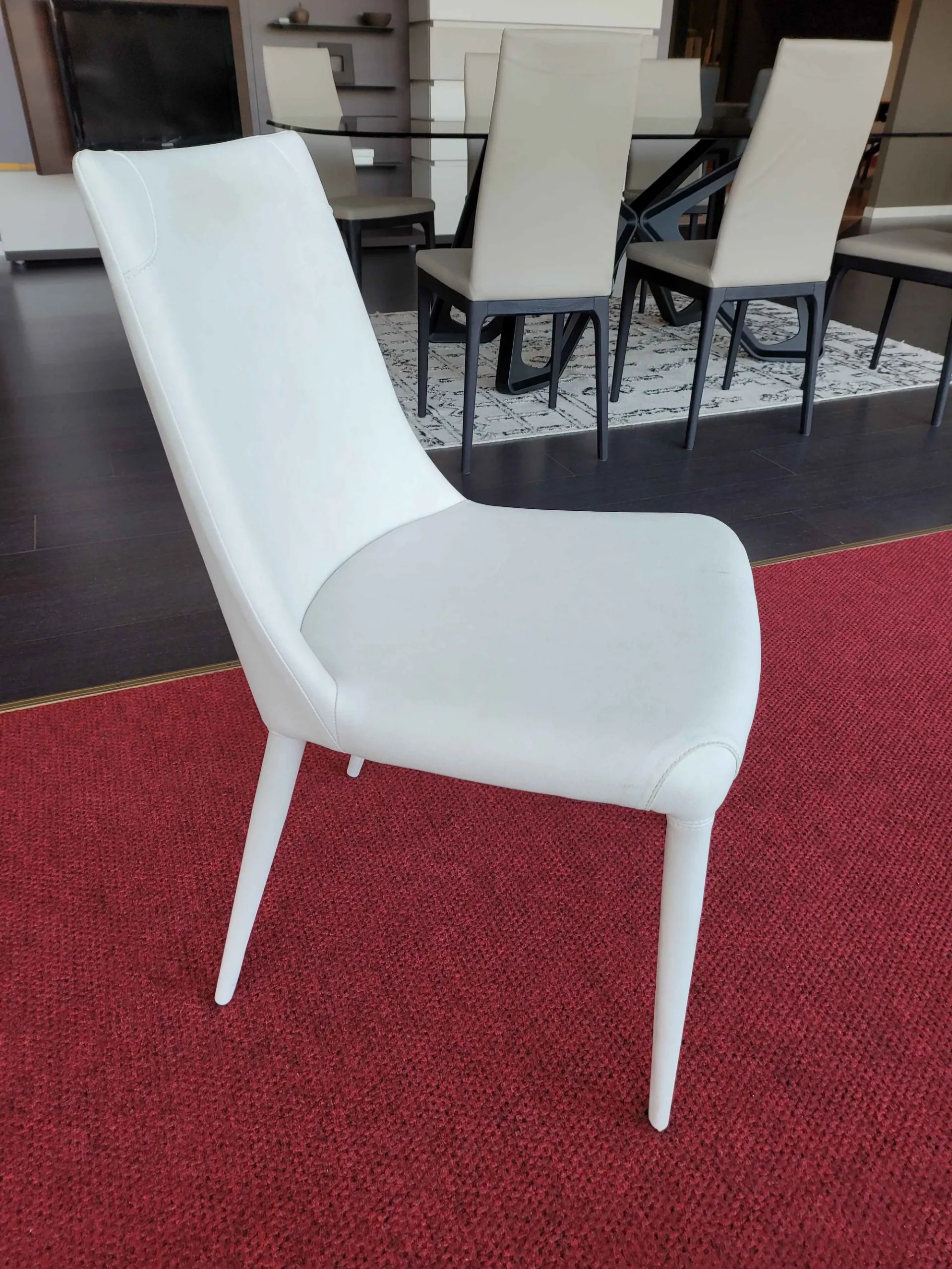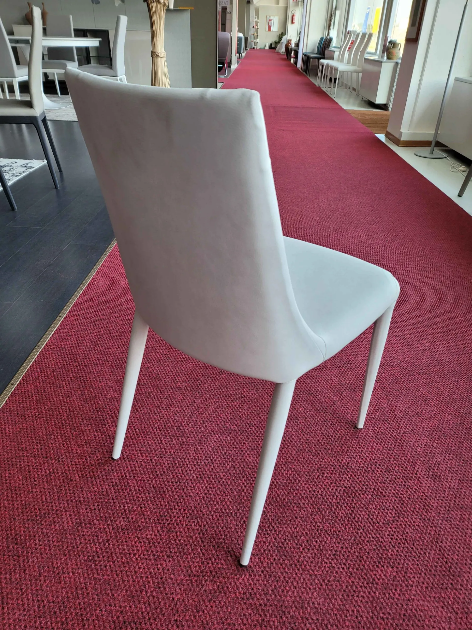 Sedia APEROL con schienale leggermente curvato e dalle linee morbide. Completamente rivestita in ecopelle nabuk colore BIANCO e particolari cuciture in prossimità delle quattro gambe.