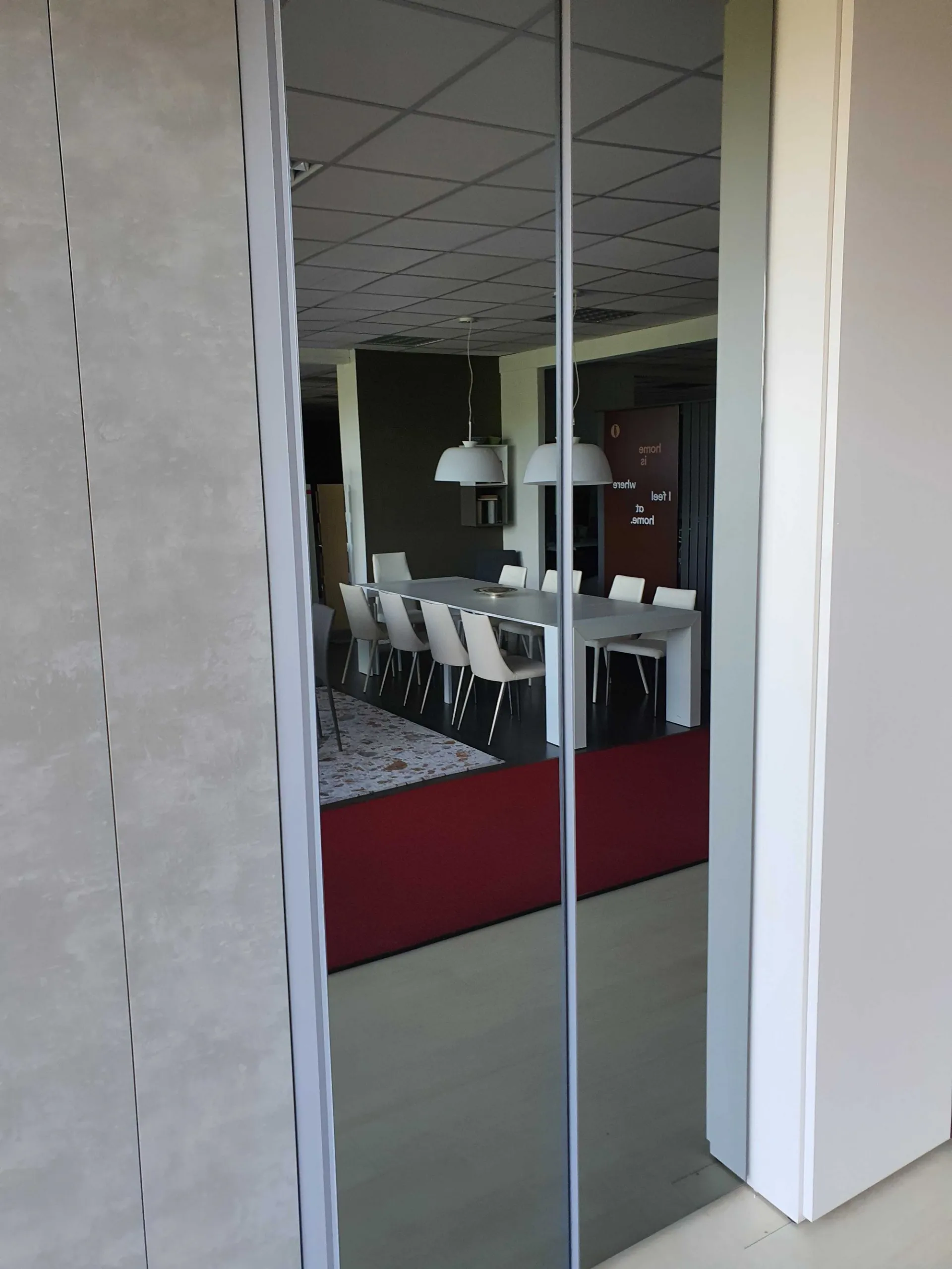 Armadio ADOK Intermezzo Essential disimpegno appendiabiti con n.2 ante battenti in specchio fumè, apertura con maniglia profilo laccato strombolil, interno finitura materico titanio, esterno finitura laccato opaco stromboli, attrezzato internamente con ripiani e n.2 appendiabiti estraibili