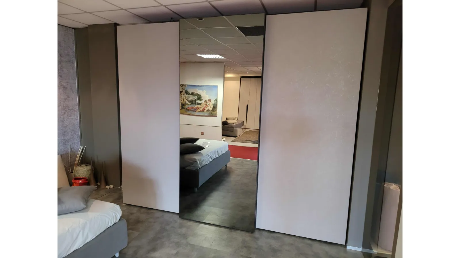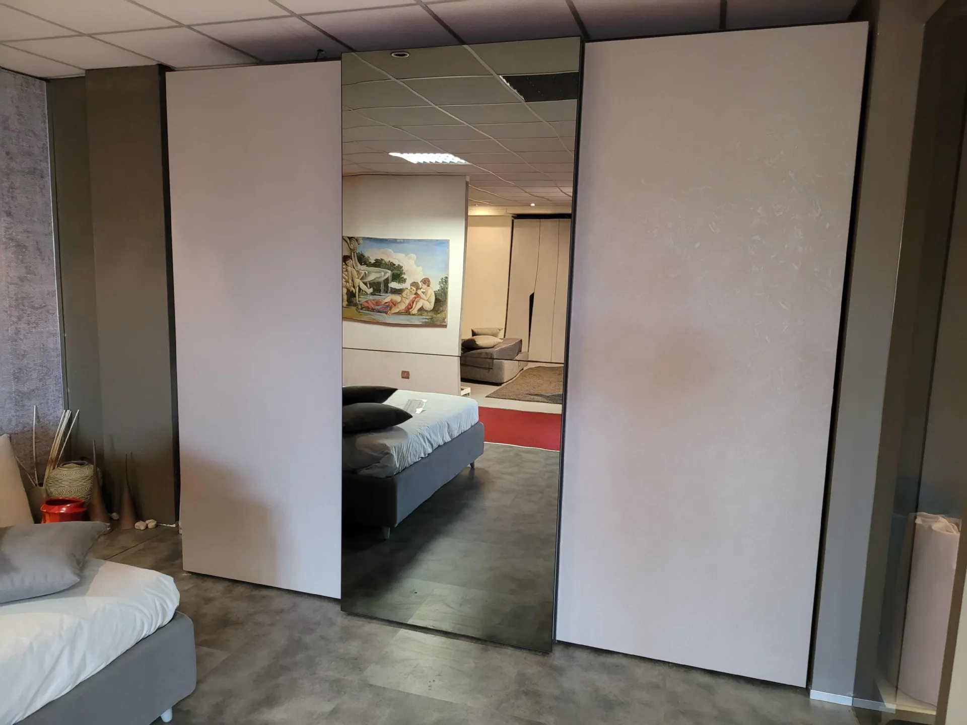 L’anta vision è posta al centro mentre lateralmente sono presenti due ante in finitura Materico Cemento Cava.
