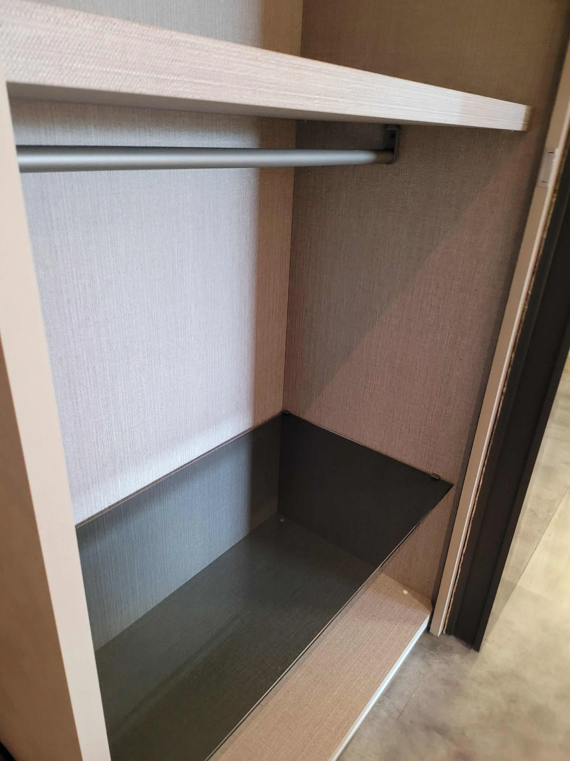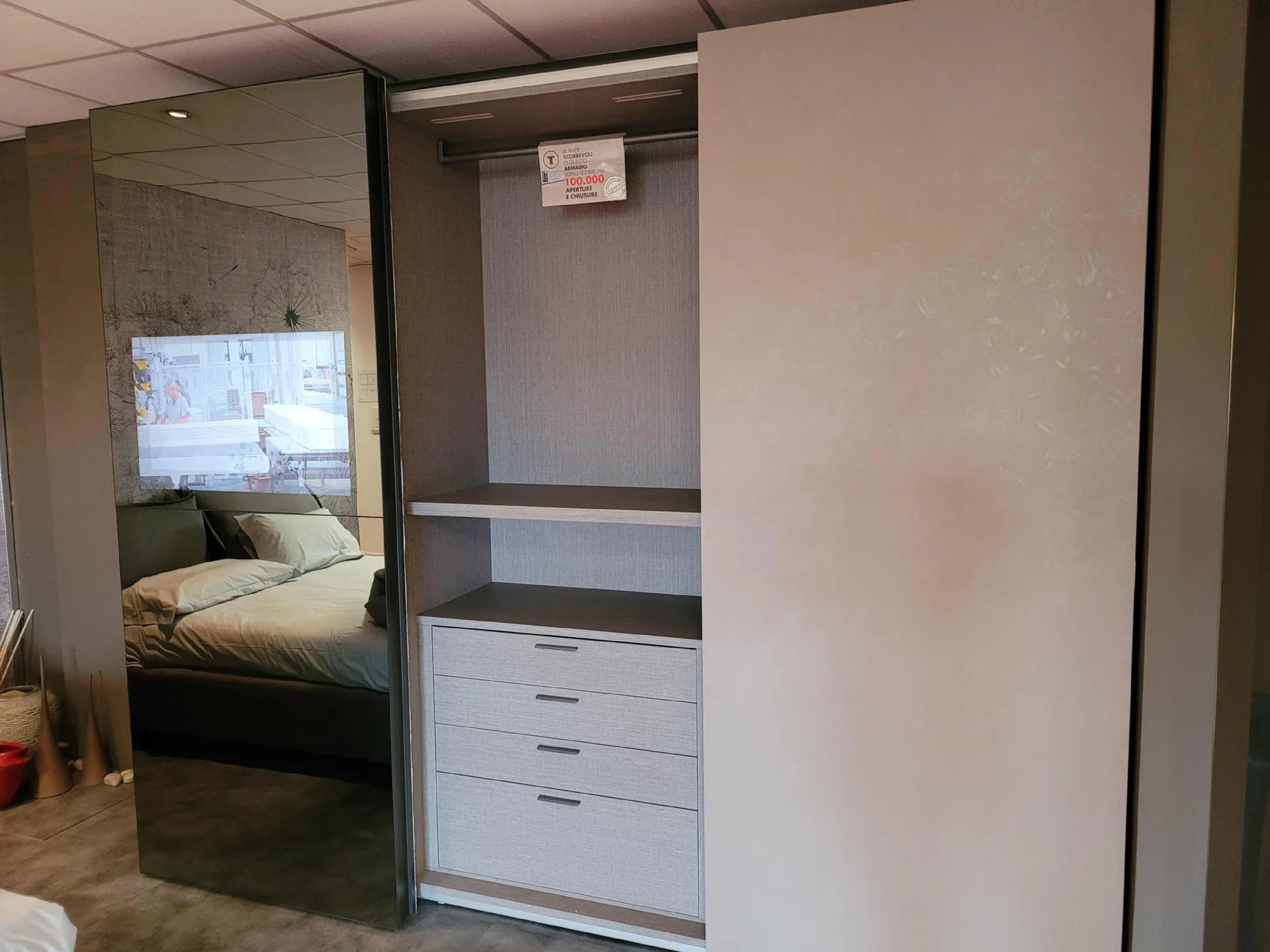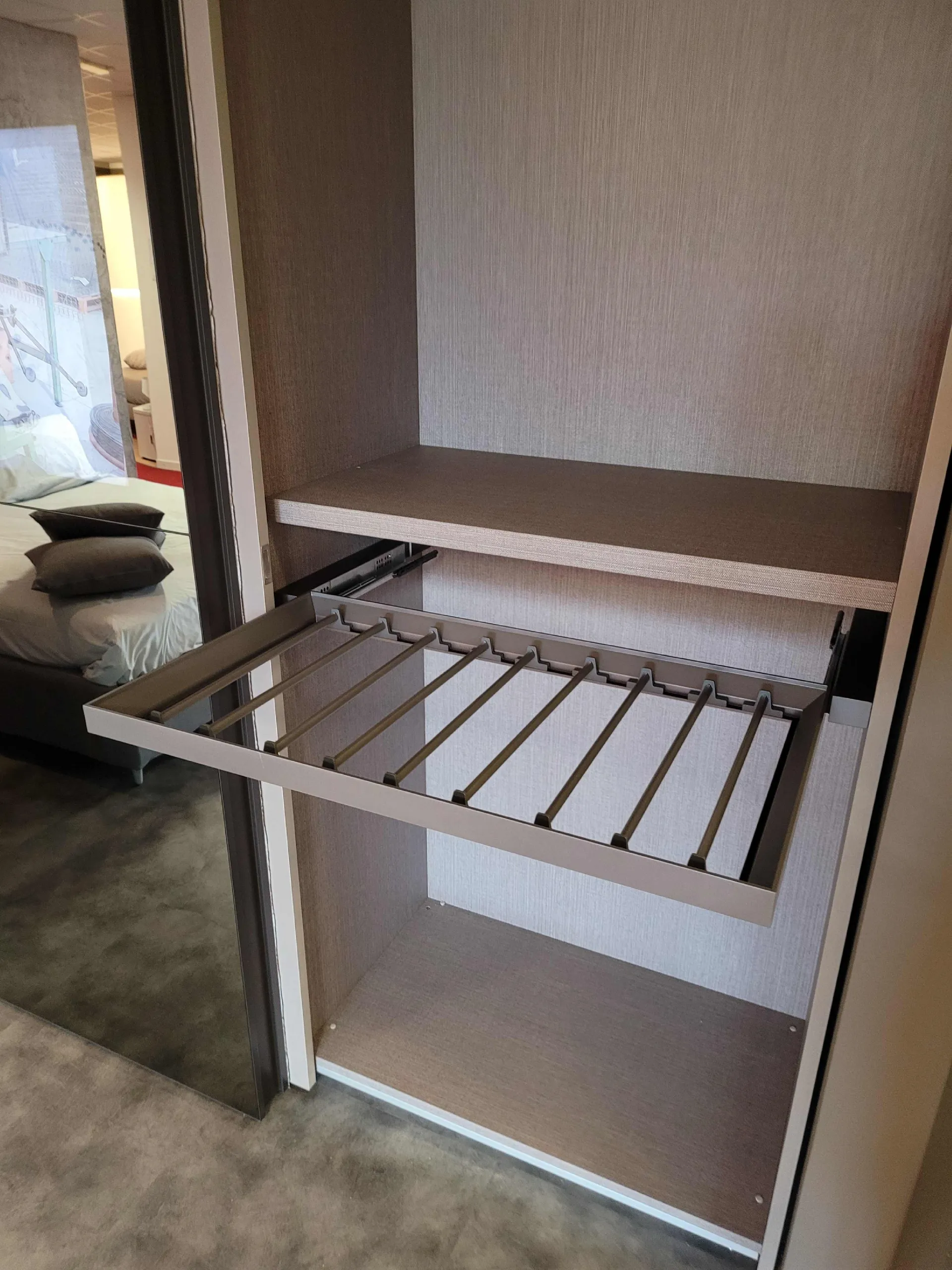 L’interno dell’armadio è nella nuova finitura Alpaca, che emula l’effetto tessuto