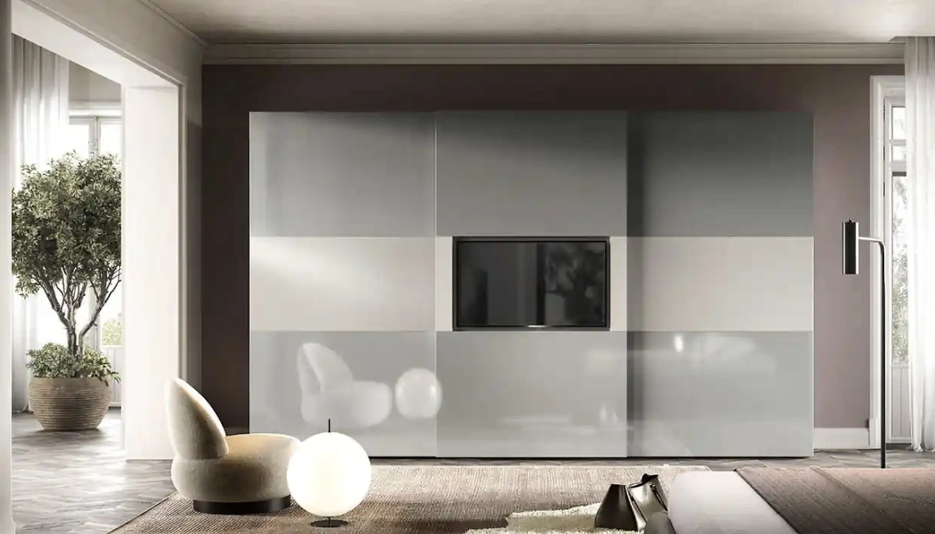 Modello Brunale TV S161 con ante scorrevoli in laccato opaco perfetto per una zona del riposo dai richiami moderni: scopri le soluzioni a muro