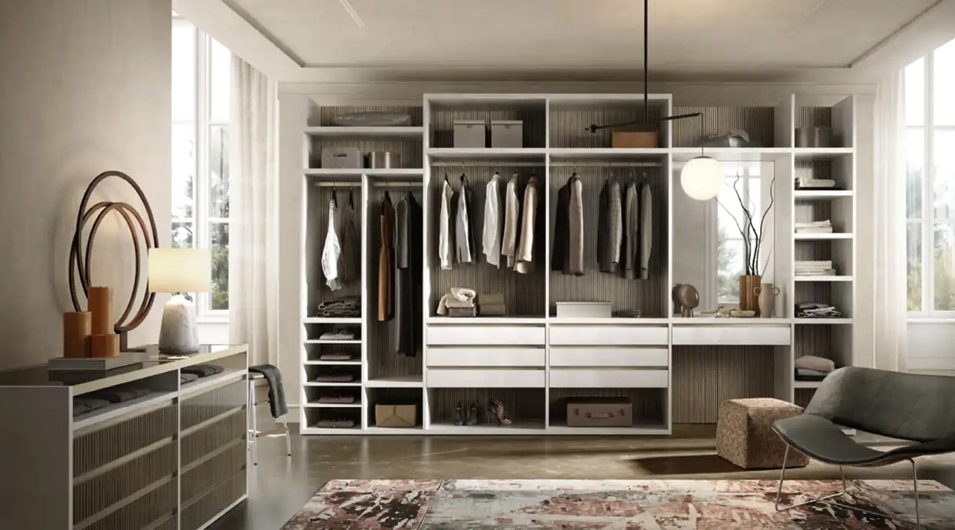 È possibile personalizzare le dimensioni e la configurazione interna della cabina armadio Taurus T521?Sì, Rusconi Arredamenti offre servizi di progettazione 3D e falegnameria per personalizzare le dimensioni standard e l'organizzazione interna della cabina Taurus T521. Questo assicura che si adatti perfettamente ai tuoi spazi e alle tue esigenze.