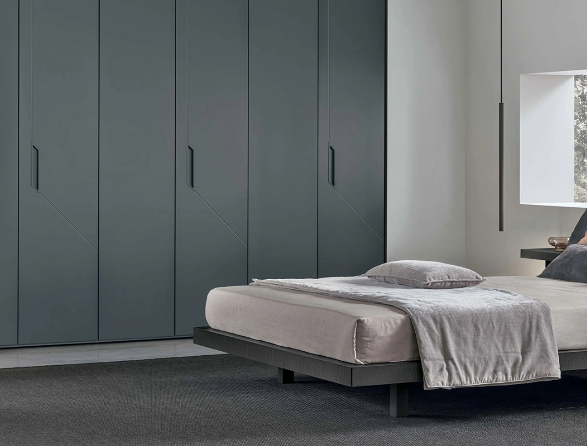 Modello Dandy con ante battenti in laccato opaco perfetto per una zona del riposo dai richiami moderni: scopri le soluzioni a muro