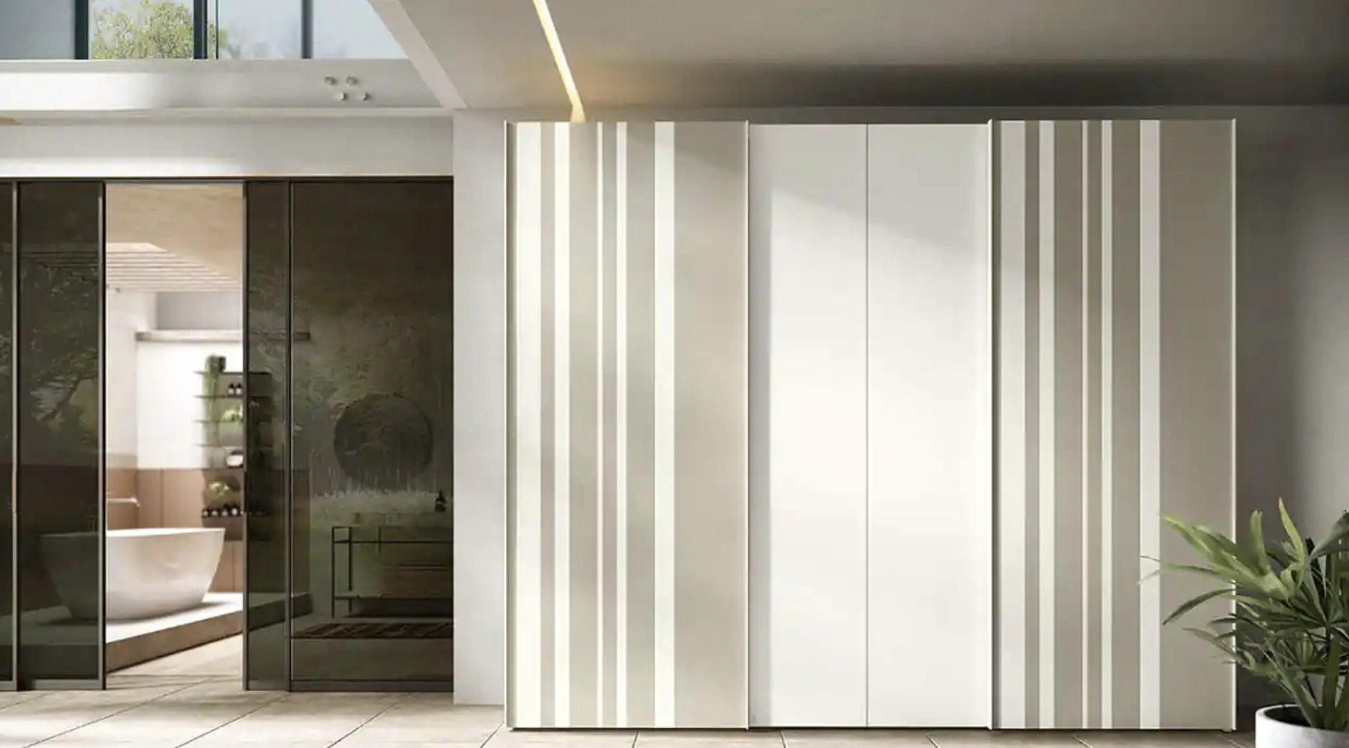 Gli Armadi a muro con ante scorrevoli di Moretti Compact Giorno Notte ti attendono: scopri il modello Libeccio e Levante Strip C253 nella fotografia