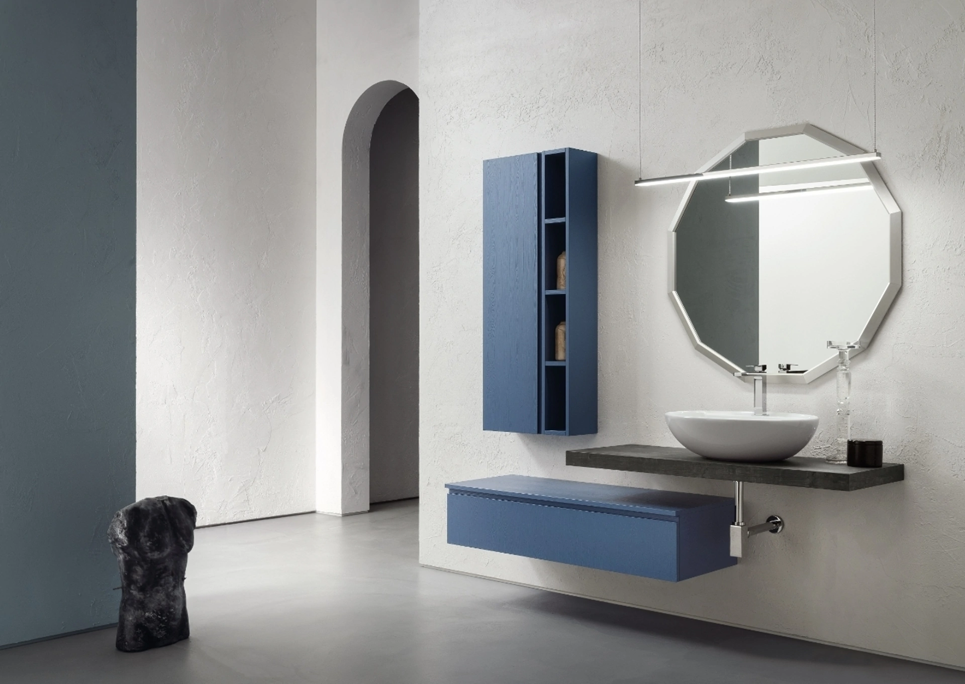 | Materiale: | Laccato opaco (finitura Cross), Ceramica (lavabo), Specchiera (mod. Omega 1) |