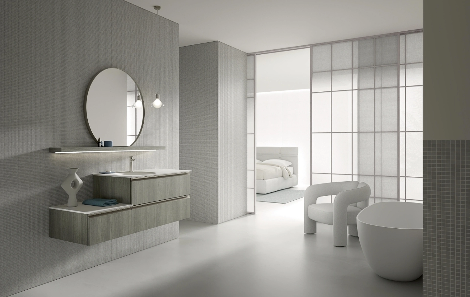Disponibile nel nostro showroom, il Mobile da Bagno BIK BK01 di Compab vi attende presso Rusconi Arredamenti s.r.l. a Cirimido. Siamo il vostro punto di riferimento per l'arredamento di qualità, offrendo prodotti di design contemporaneo con la garanzia del nostro servizio. Questo elegante mobile sospeso, caratterizzato da struttura e frontali in nobilitato finitura Pepper 282, è un esempio perfetto di design e funzionalità. Include un raffinato lavabo consolle 'Flexi' in Corian da 96 cm e si completa con una specchiera ROUND-C laccato opaco M7 desert, illuminata da una moderna lampada LAMDA. Venite a toccare con mano la qualità e l'estetica di questo mobile, ideale per chi cerca soluzioni d'arredo bagno distintive e di grande impatto visivo.