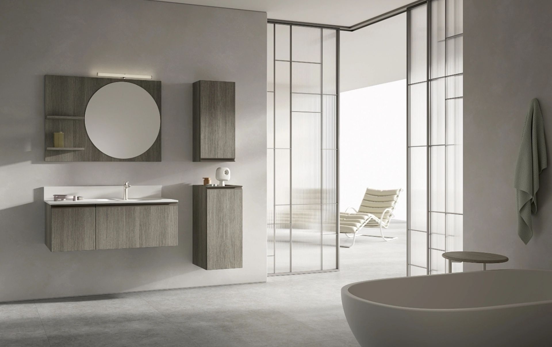 Il BIK BK07 di Compab, un mobile da bagno sospeso, si distingue per la sua struttura e i frontali in nobilitato, impreziositi dalla finitura Pepper 282. L'elemento centrale è il lavabo consolle “Rugby” in Corian, progettato con una lunghezza di 106 cm e una vasca posizionata strategicamente a destra per ottimizzare lo spazio e la funzionalità. La composizione è completata da una specchiera modello RE-TONDO e da un faretto per specchio modello ROLL 50, che integrano design e illuminazione specifica per l'ambiente bagno. Ogni componente è progettato per garantire longevità e resistenza, assicurando un'affidabilità costante nel tempo.