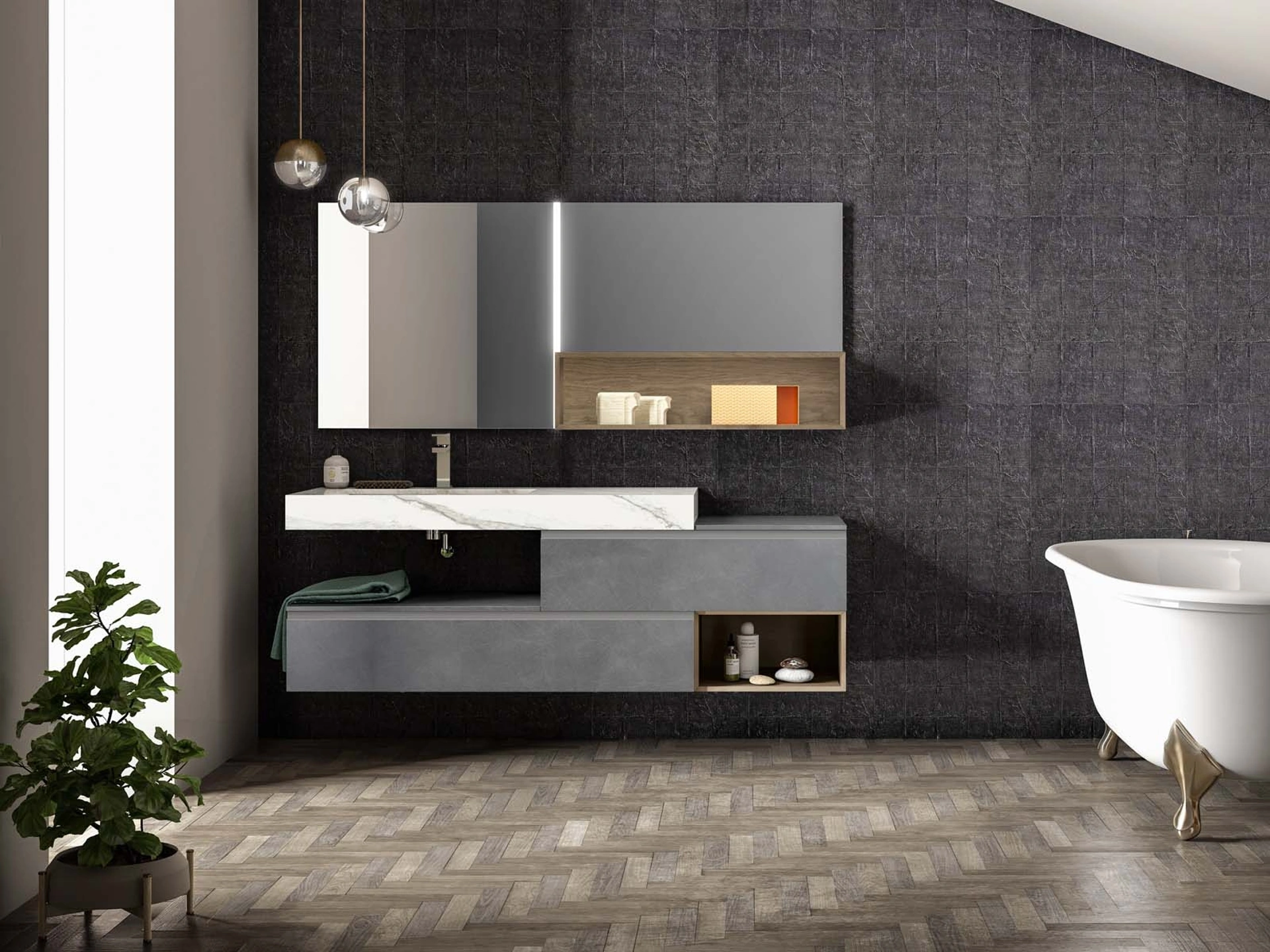 Scopri la nostra serie di Arredo Bagno moderno e mobili bagno sospesi in laccato opaco, come il modello Lapis 06