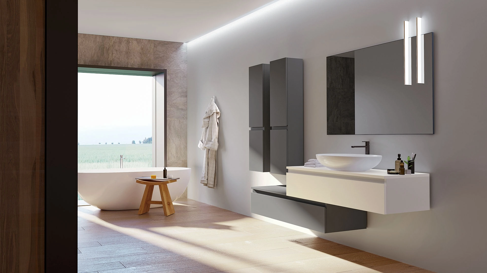 Scopri la nostra serie di Arredo Bagno moderno e mobili bagno sospesi in laccato opaco, come il modello Happy 13