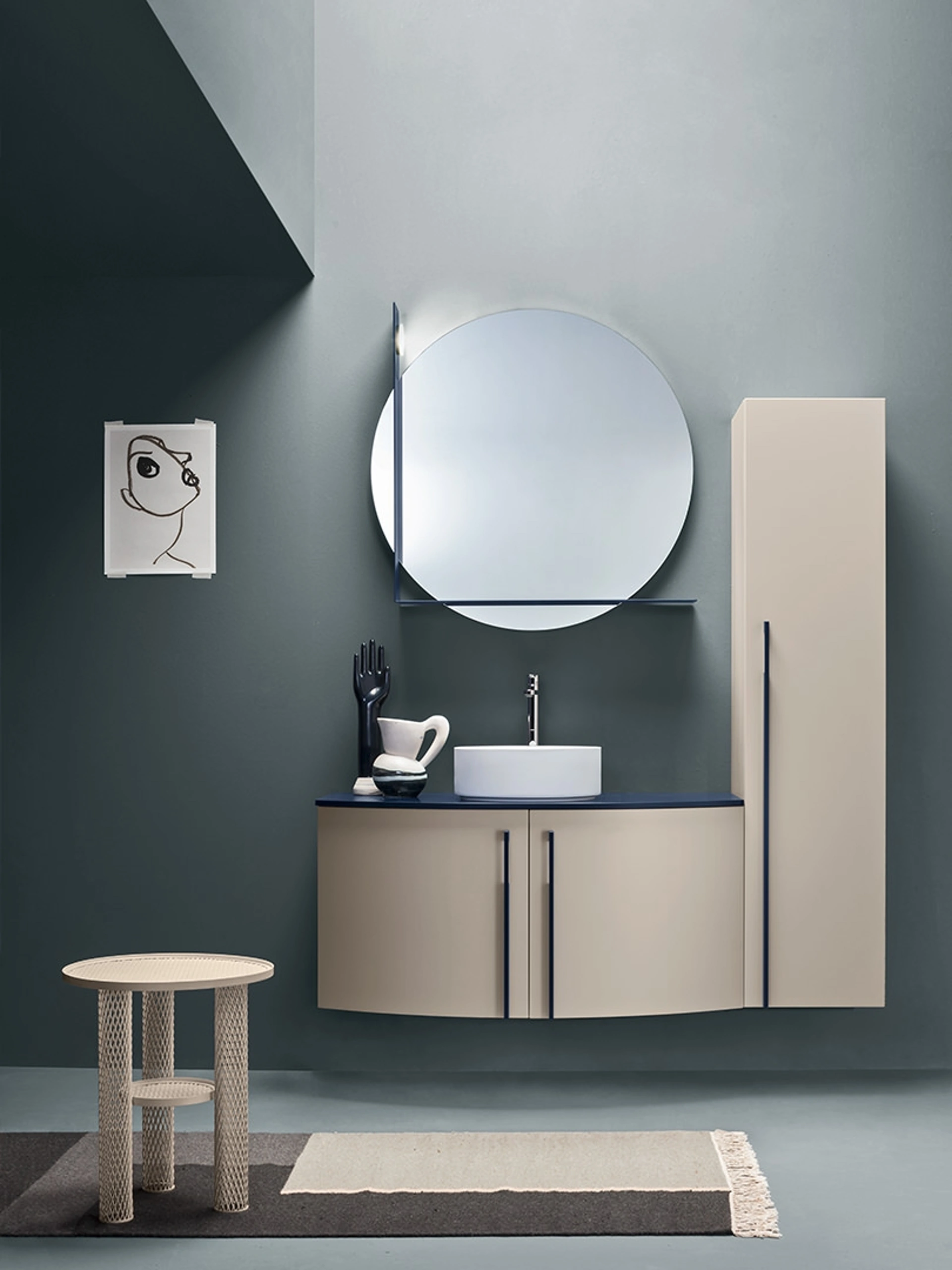 Il sistema d'arredo bagno Round 04 Deep Blue di Ardeco, ideato da Enrico Cesana, si distingue per la sua interpretazione contemporanea che armonizza forme curve e sinuose con un'estetica rigorosa e una semplicità intramontabile. La variante 'Deep Blue' enfatizza l'uso di una tonalità blu intensa per la struttura e il piano lavabo in metallo, creando un contrasto sofisticato, ad esempio, con il lavandino in Cristalplant. Questa finitura cromatica valorizza anche le maniglie e si estende alla cornice della specchiera, che include una pratica mensola in metallo. La collezione è concepita per offrire un'ampia personalizzazione attraverso diverse finiture e configurazioni, garantendo soluzioni adattabili per spazi bagno che richiedono sia accoglienza che funzionalità avanzate. L'ingegnerizzazione avanzata e la cura artigianale si fondono per creare un prodotto che soddisfa le più esigenti richieste funzionali ed estetiche del design contemporaneo.