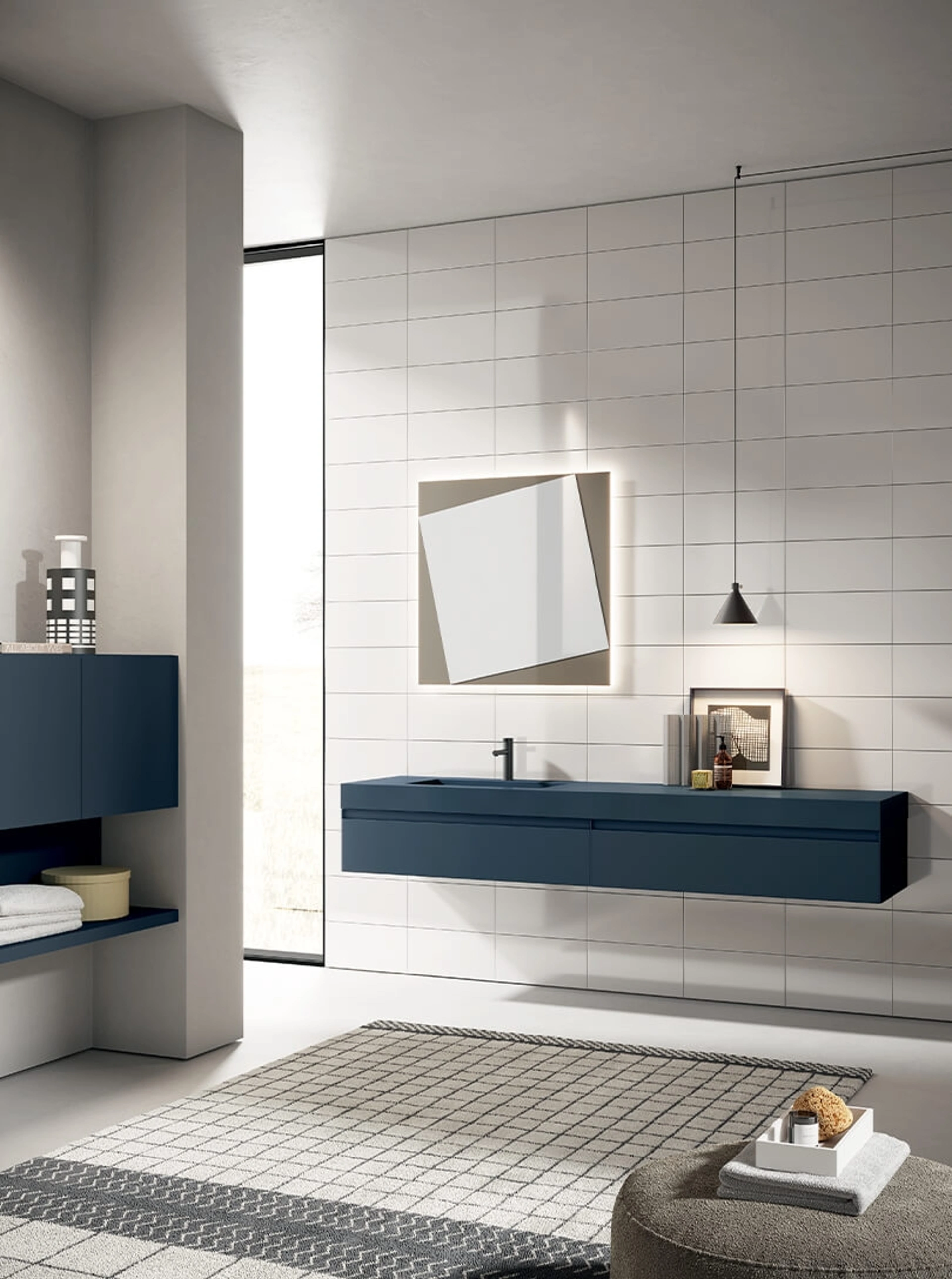 Il mobile bagno sospeso Yoko 08, parte dell'innovativa collezione Ardeco firmata da Enrico Cesana, si distingue per il suo design intrinsecamente minimale e il profilo ultrasottile, elementi che elevano la funzionalità dello spazio bagno. La struttura è ingegnerizzata per integrare cornici contenitive che esaltano una vasta gamma di finiture materiche, tra cui vetri, specchi, gres porcellanato, laccati opachi ed essenze lignee per i pannelli frontali. Questa configurazione specifica include frontali in finitura Blu Notte opaco, abbinati a un lavabo Mistral in tonalità Blu Notte e una specchiera Illusion, offrendo una soluzione completa e coerente per l'arredo contemporaneo. La progettazione del sistema garantisce durabilità e un'estetica raffinata, assicurando prestazioni ottimali nel tempo.