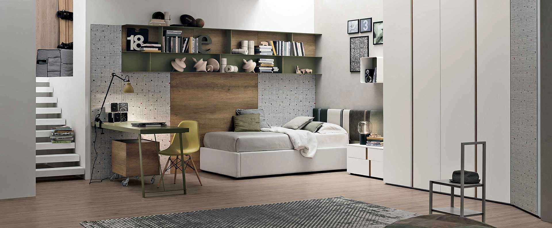 Quali elementi sono inclusi nella Composizione 02 di Tomasella per camerette?La Composizione 02 è una soluzione modulare Tomasella pensata per bambini e ragazzi. Può includere letto, armadio, scrivania e libreria, offrendo modularità e crescita nel tempo per adattarsi a ogni esigenza.