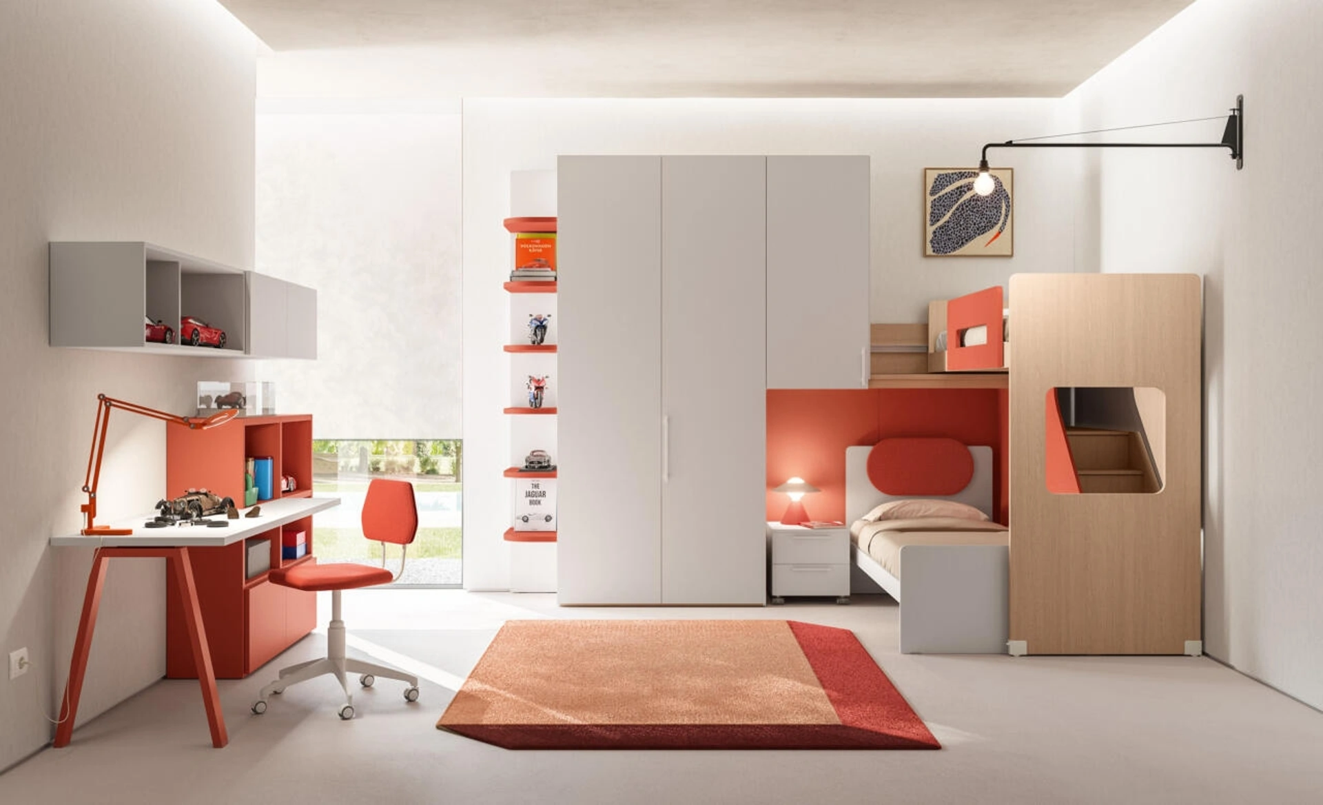 La Cameretta Salvaspazio 56 di Mistral, parte dell'innovativa collezione Salvaspazio, è progettata per ottimizzare gli spazi. Questa configurazione versatile integra un letto soppalco scorrevole Avantgarde L.90, un armadio battente con anta Liscia e modulo terminale con ripiani, uno scrittoio T45 funzionale e box pensili a giorno o con anta. Le finiture, tra cui Melaminico Arena, Velluto e Corallo, offrono ampie possibilità di personalizzazione per adattarsi a ogni esigenza di design. Il sistema modulare garantisce funzionalità e durabilità, con un'attenzione particolare alla qualità dei materiali. Questa soluzione rappresenta l'eccellenza nella progettazione di ambienti compatti, garantendo massima efficienza e flessibilità d'uso.