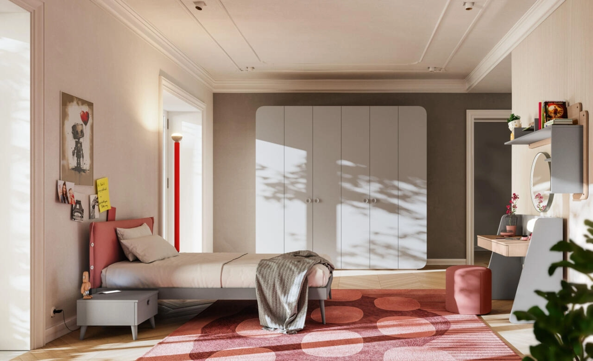 Cameretta Letto a Terra 13 di Mistral rappresenta una soluzione innovativa per la zona notte. Questa configurazione, parte della linea di soluzioni letto a pavimento, è studiata per ottimizzare lo spazio e offrire massima funzionalità. Il set si compone di un letto singolo modello One con testiera integrata (L.120), un capiente guardaroba ad ante battenti con frontali lineari e moduli terminali sagomati, una postazione studio Vanity completa di cassetto, uno specchio Makeup e un mobile contenitore Tuxon. La scelta dei materiali e la cura dei dettagli costruttivi sono prioritari. È possibile scegliere tra finiture contemporanee come Arena, Velluto, Grigio e il codice DA25, pensate per integrarsi armoniosamente in diversi contesti stilistici. La flessibilità progettuale e l'attenzione ai dettagli tecnici garantiscono un'ottimizzazione degli spazi e una durabilità nel tempo.