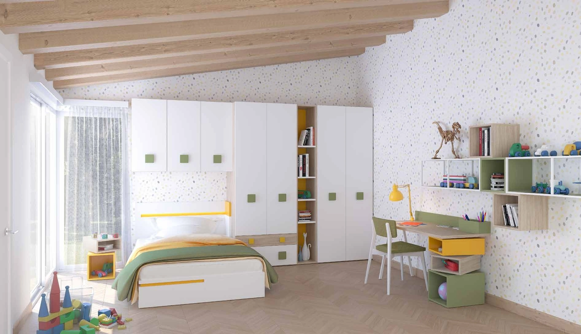 Esplora la cameretta Open 06 S75, una soluzione d'arredo che unisce design contemporaneo e massima funzionalità. Questa composizione ingegnosa include un armadio modello OPEN, pensili e libreria SHANGHAI, un letto CUBE, e gli elementi WHEEL per comodino e scrittoio 130. Dettagli come i pensili in metallo FRAME e KUBOCOLOR, e la sedia ELLEN con struttura bianca e seduta in tessuto verde foresta, arricchiscono l'insieme. Lo scrittoio, con gamba in metallo e cassetti, si integra perfettamente nell'ambiente. Realizzata prevalentemente in melaminico, questa cameretta assicura durabilità e semplicità di manutenzione. Per un ambiente che non scende a compromessi sulla qualità, questa proposta offre stile e resistenza nel tempo.