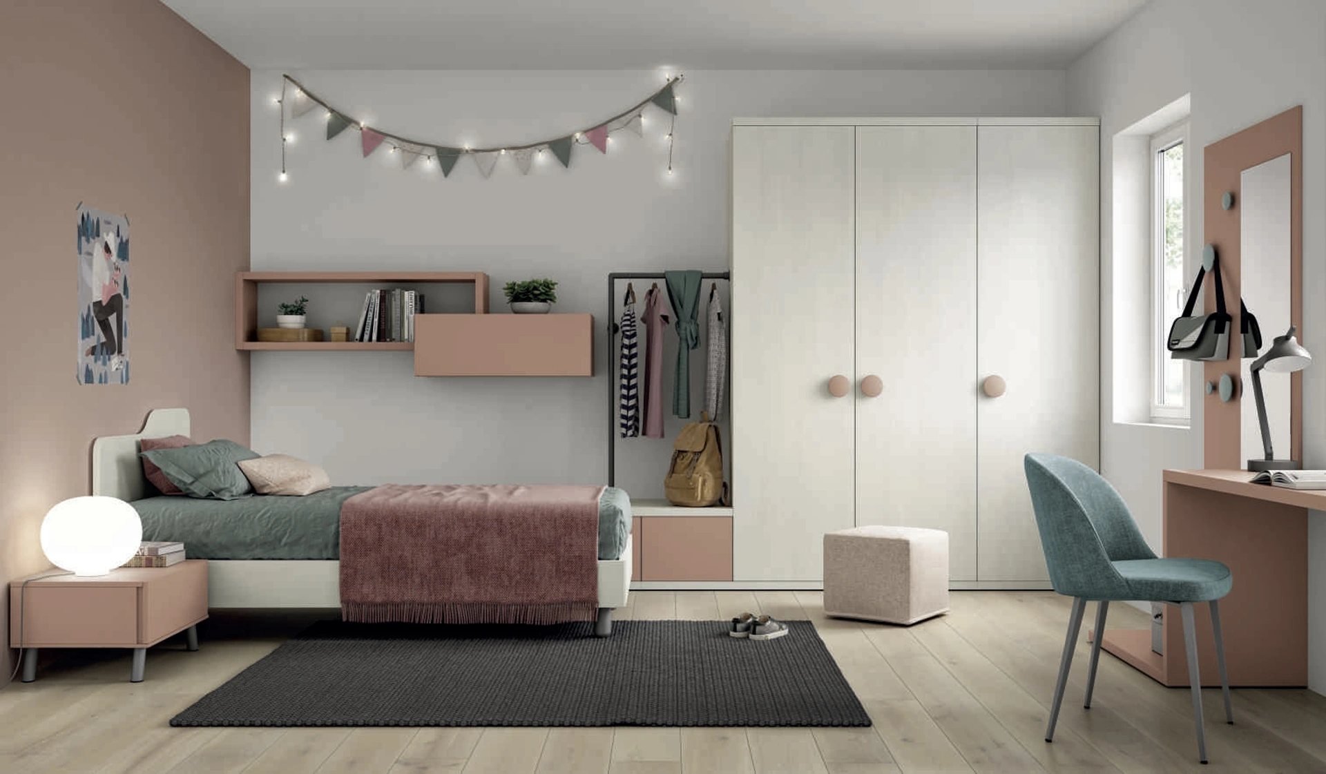 Quali tipologie di letti e soluzioni d'arredo sono disponibili per la cameretta "Space 005"?La collezione "Space 005" offre soluzioni modulari con letti singoli, a castello o a soppalco. È possibile integrarla con armadi, scrivanie e librerie per adattarsi alle esigenze dei bambini e ragazzi, crescendo con loro nel tempo.