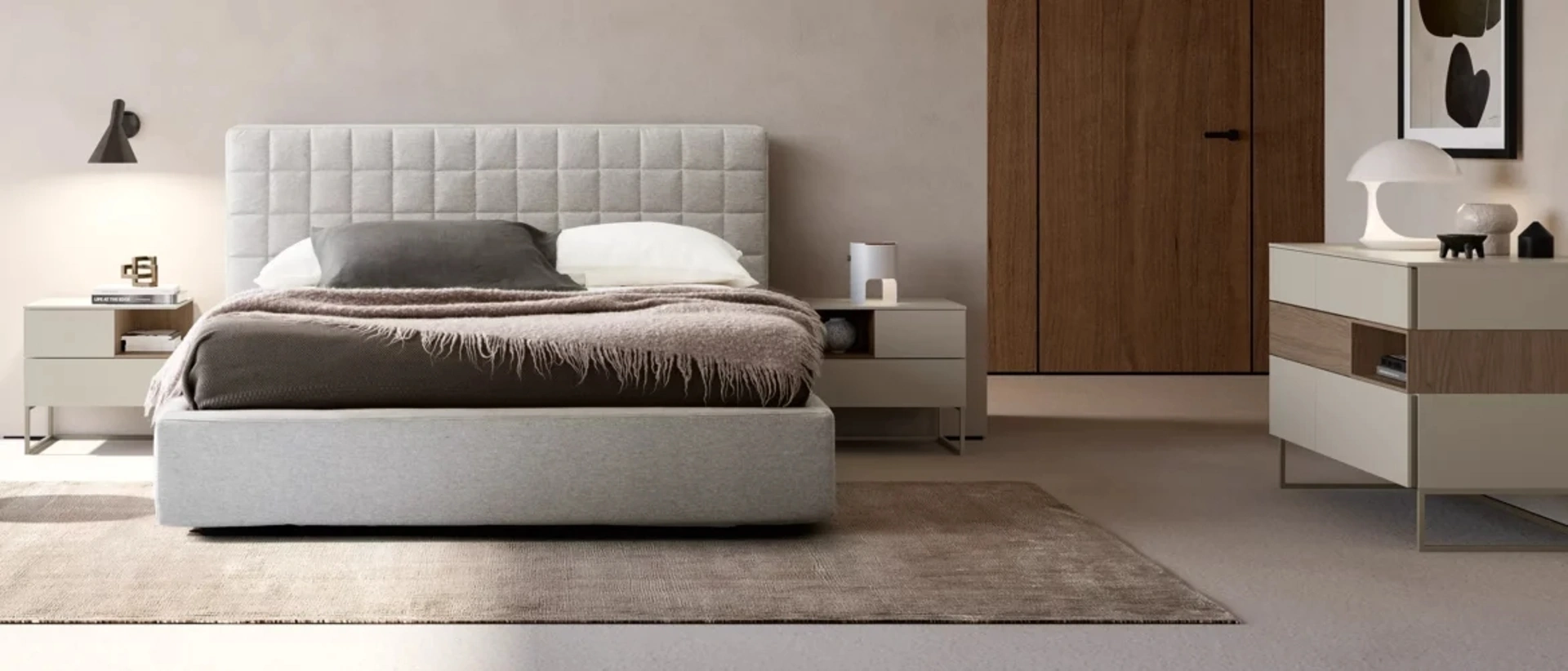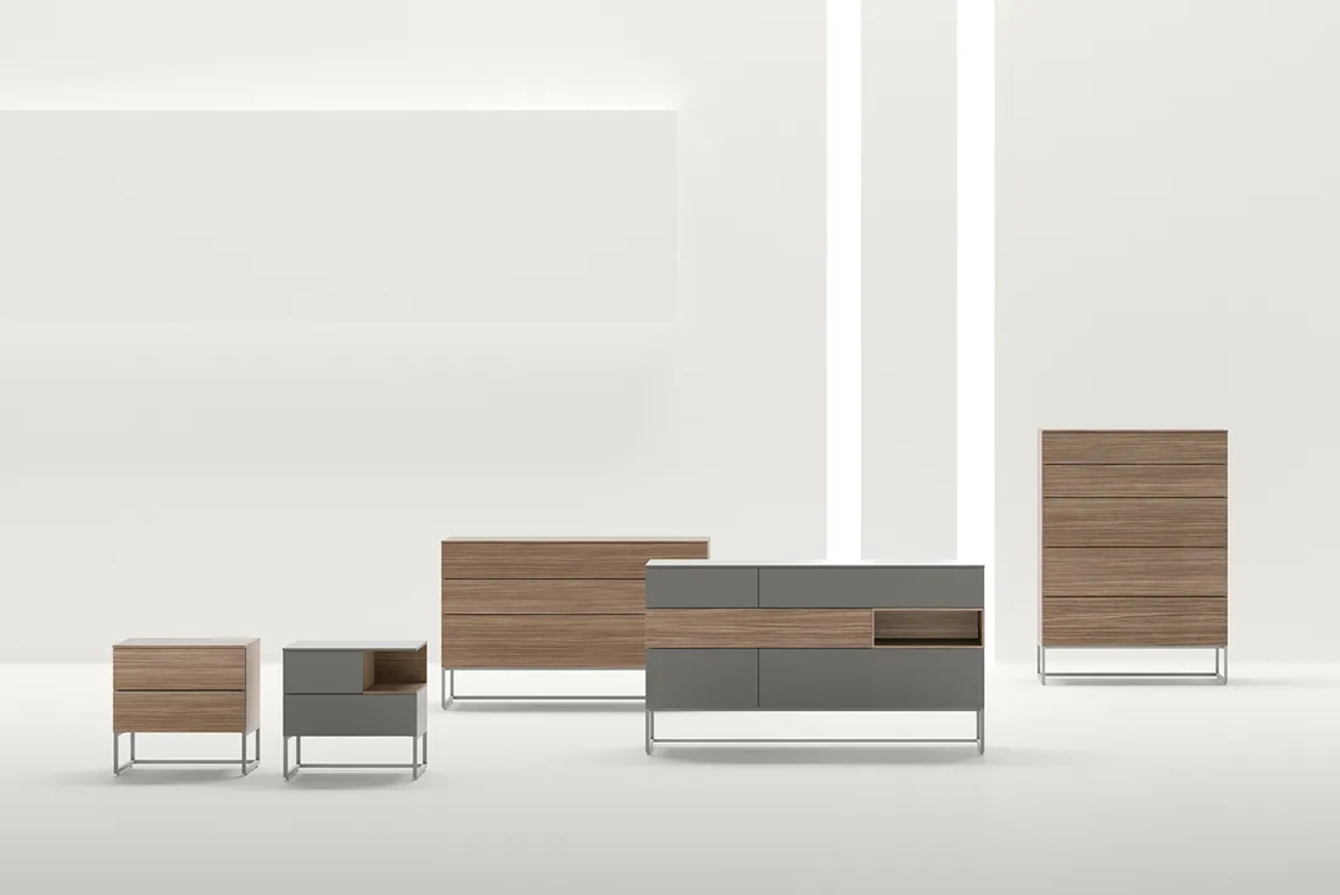 Il Gruppo Notte Code, espressione della linea Unique di Adok, è concepito per offrire soluzioni d'arredo notte altamente funzionali e dal design distintivo. La sua architettura si basa su una struttura a parallelepipedo che integra un sofisticato gioco di volumi, enfatizzato dalle eleganti maniglie a gola. La costruzione impiega pannelli nobilitati di alta qualità e frontali dei cassetti in MDF con un taglio preciso a 60°, garantendo robustezza e un'estetica curata. Le guide dei cassetti sono dotate di sistema rallentato per un'apertura e chiusura fluida e silenziosa, mentre i piedini regolabili permettono un perfetto livellamento. È inoltre possibile scegliere tra configurazioni con fianchi sottili o spessi, adattandosi a diverse esigenze stilistiche e spaziali. La progettazione del Gruppo Notte Code mira a garantire una durabilità strutturale e un'estetica raffinata, assicurando un'esperienza d'uso ottimale nel tempo.