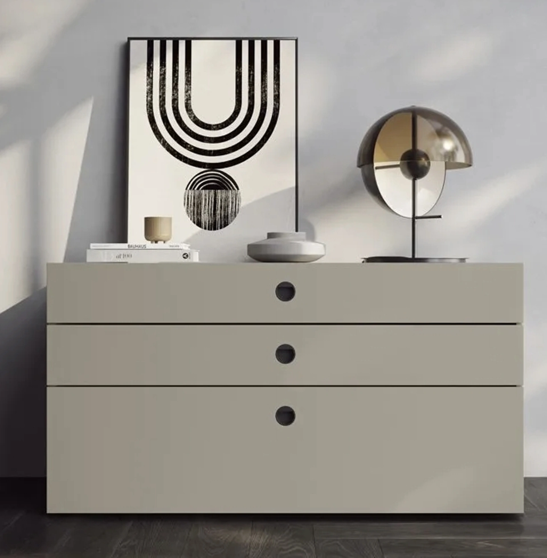 Comò moderno in laccato opaco con maniglie tonde ad incasso rivestite in tessuto anche in versione settimanale e comodino