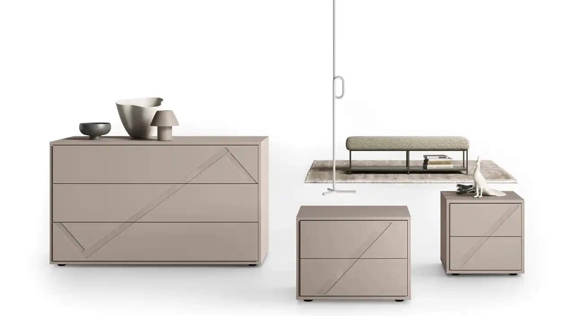 Comodini e gruppi notte in laccato opaco per ambienti design: scopri il modello Gruppo Notte Volturno presente in foto