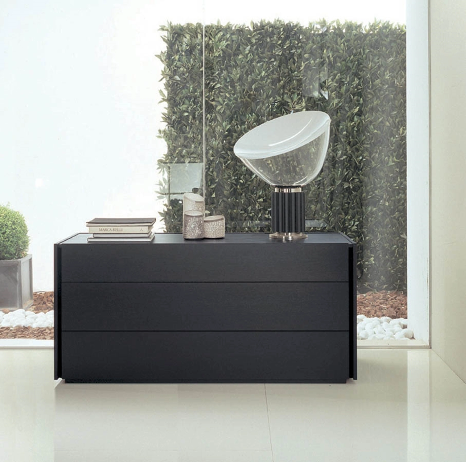 Comò di design dalla linea essenziale con frontale ridotto rispetto alla struttura