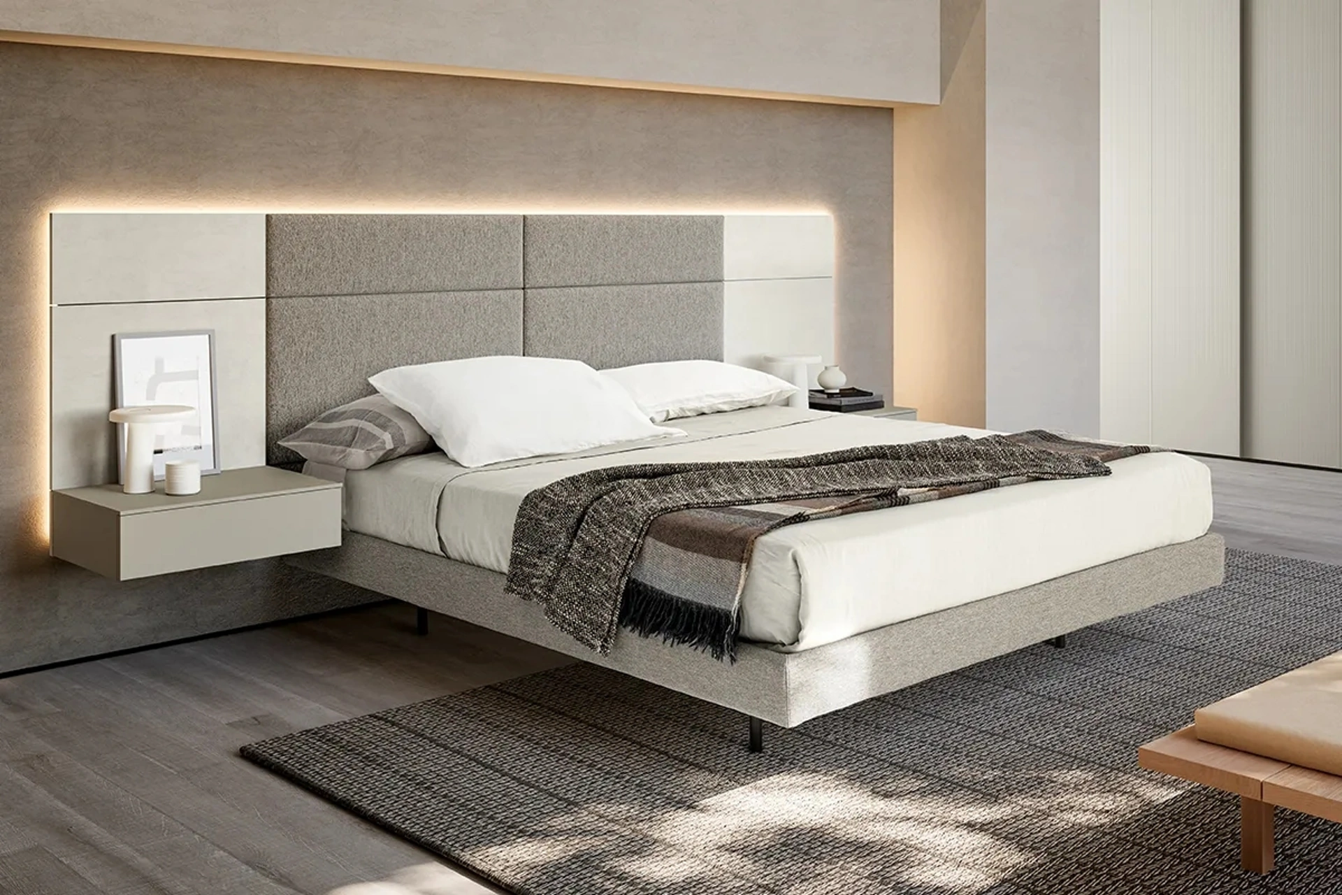 Letto matrimoniale Modula con testata imbottita e cassettone