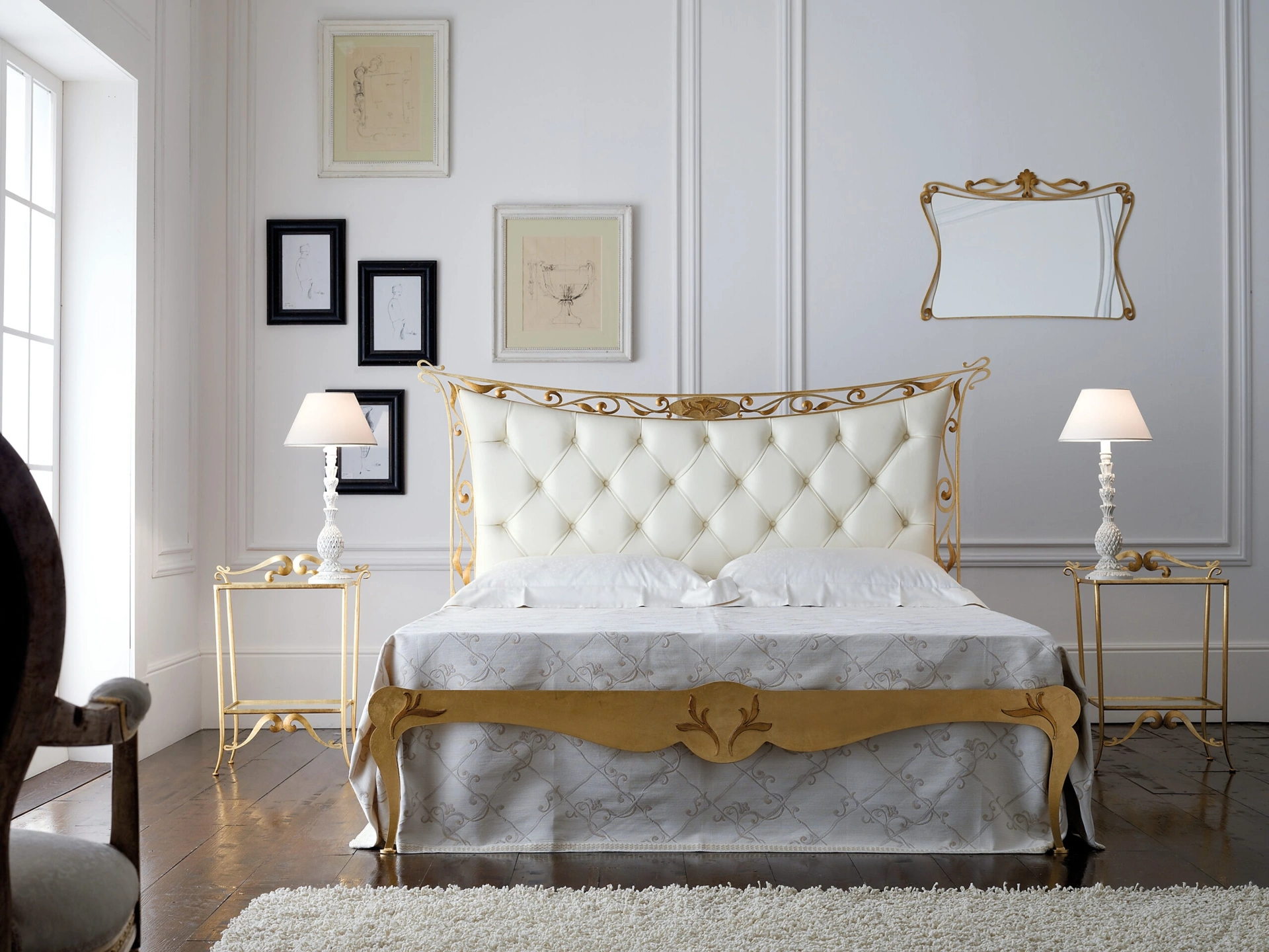 L'elegante letto matrimoniale Agata, firmato Florentiabed, si distingue per la sua robusta struttura in Ferro, vera pelle bianco neve. Il design è impreziosito da un raffinato pannello capitonné, meticolosamente rivestito in vera pelle di tonalità bianco neve, che aggiunge un tocco di lusso e comfort visivo. La finitura in Finitura foglia argento meccata conferisce al letto un aspetto distintivo e di grande impatto estetico. Progettato per garantire la massima stabilità e durata, include un sistema di sostegni integrato specificamente per reti sospese, ottimizzando il supporto e la qualità del riposo. La selezione accurata dei materiali e la precisione costruttiva assicurano un prodotto di elevata qualità, destinato a durare.