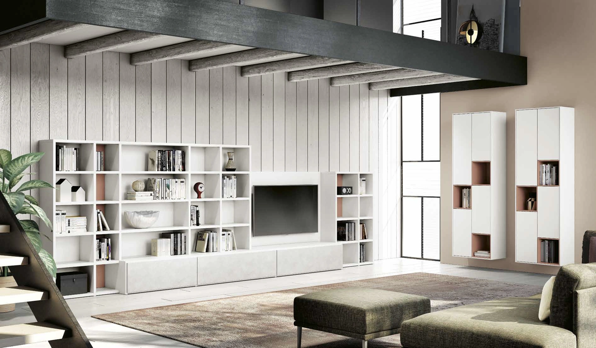 Mobile soggiorno per stanze moderne disponibile in laccato opaco: scopri una tra le nostre più originali soluzioni a muro