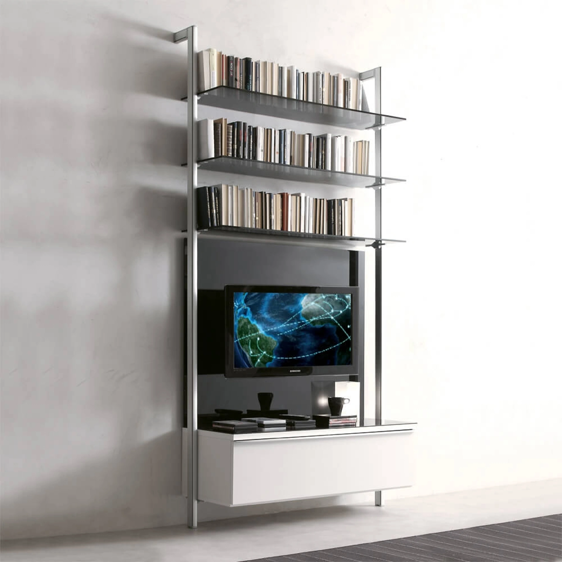 | Materiale: | Alluminio (montanti), Cristallo (piani), Melaminico (piani e contenitori), Legno laccato (piani e contenitori) |