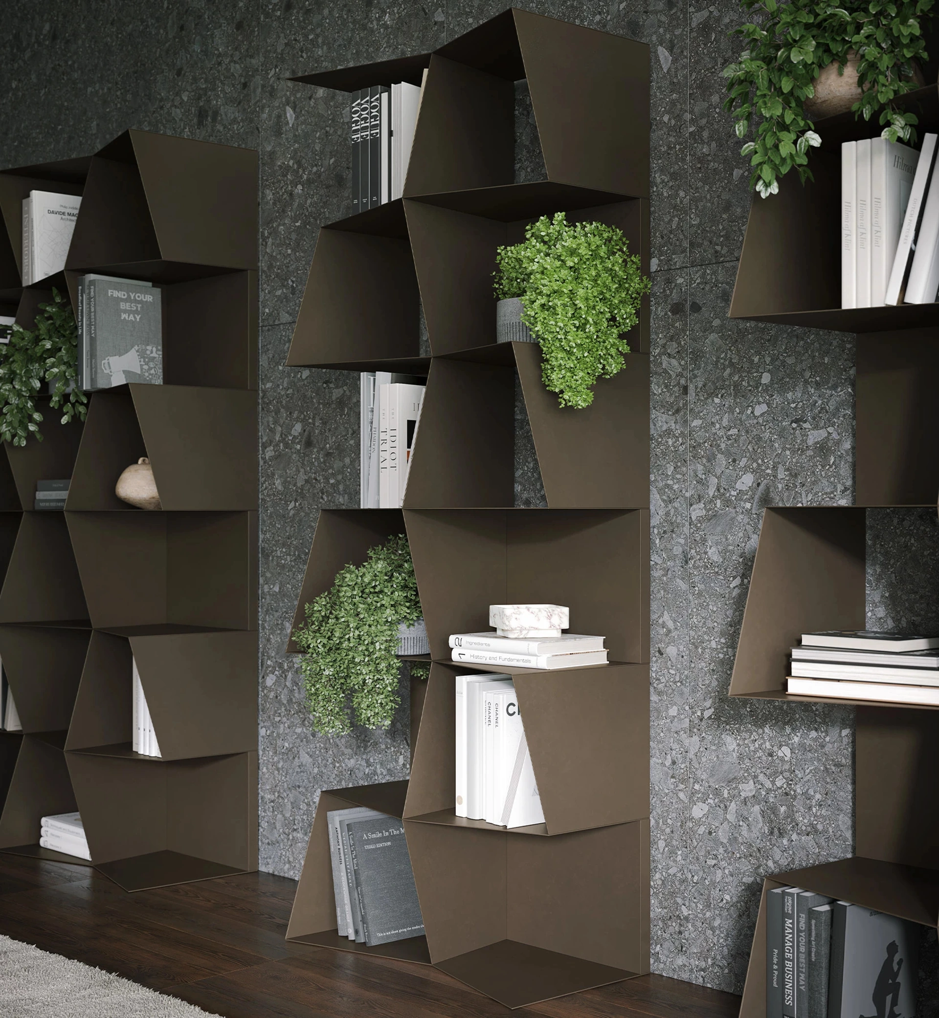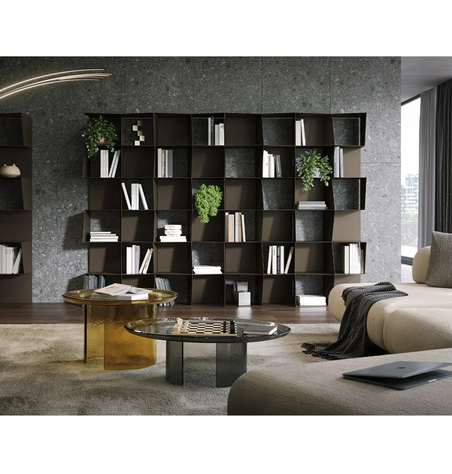 La libreria Checker di Tonin Casa si distingue per la sua architettura interna e la composizione strutturale, concepita per un'estetica dinamica e una funzionalità intrinseca. La disposizione diagonale dei pannelli laterali non solo crea un impatto visivo ritmico, ma assicura anche una notevole robustezza. I tagli obliqui sui frontali dei ripiani e dei montanti contribuiscono a un'impressione di leggerezza e movimento. Questa configurazione, dal profilo non eccessivamente invasivo, consente una perfetta integrazione con gli elementi d'arredo e gli oggetti esposti, valorizzandoli senza appesantire l'ambiente. Rappresenta l'eccellenza del design italiano, combinando innovazione formale e durabilità dei componenti.