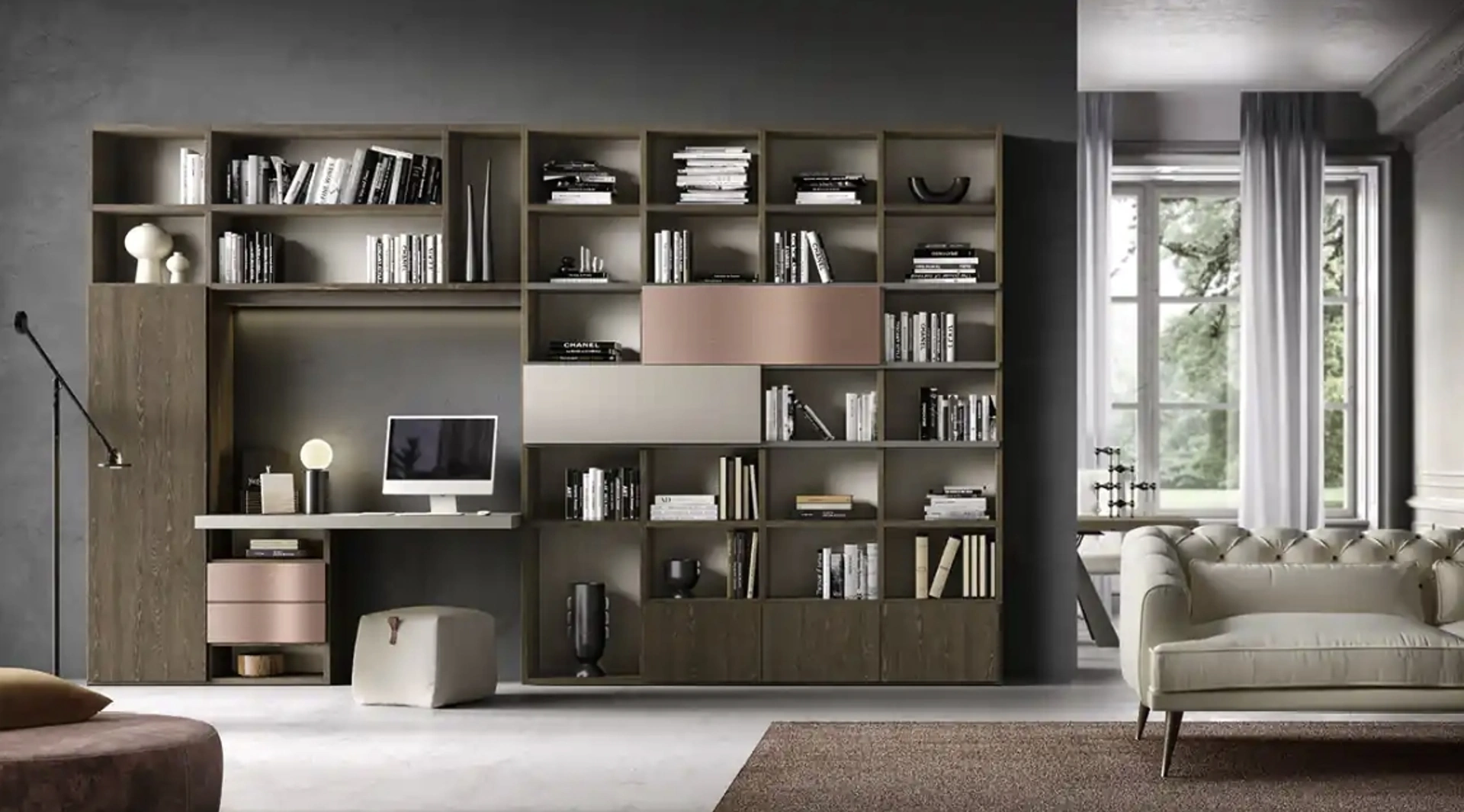 Quali tipologie di configurazione sono disponibili per la libreria Kosmos KL215?La libreria Kosmos KL215 può essere configurata in diverse tipologie, come a giorno, con ante o in versione modulare. Il nostro servizio di progettazione 3D ti aiuterà a trovare la soluzione ideale per il tuo spazio e le tue esigenze.
