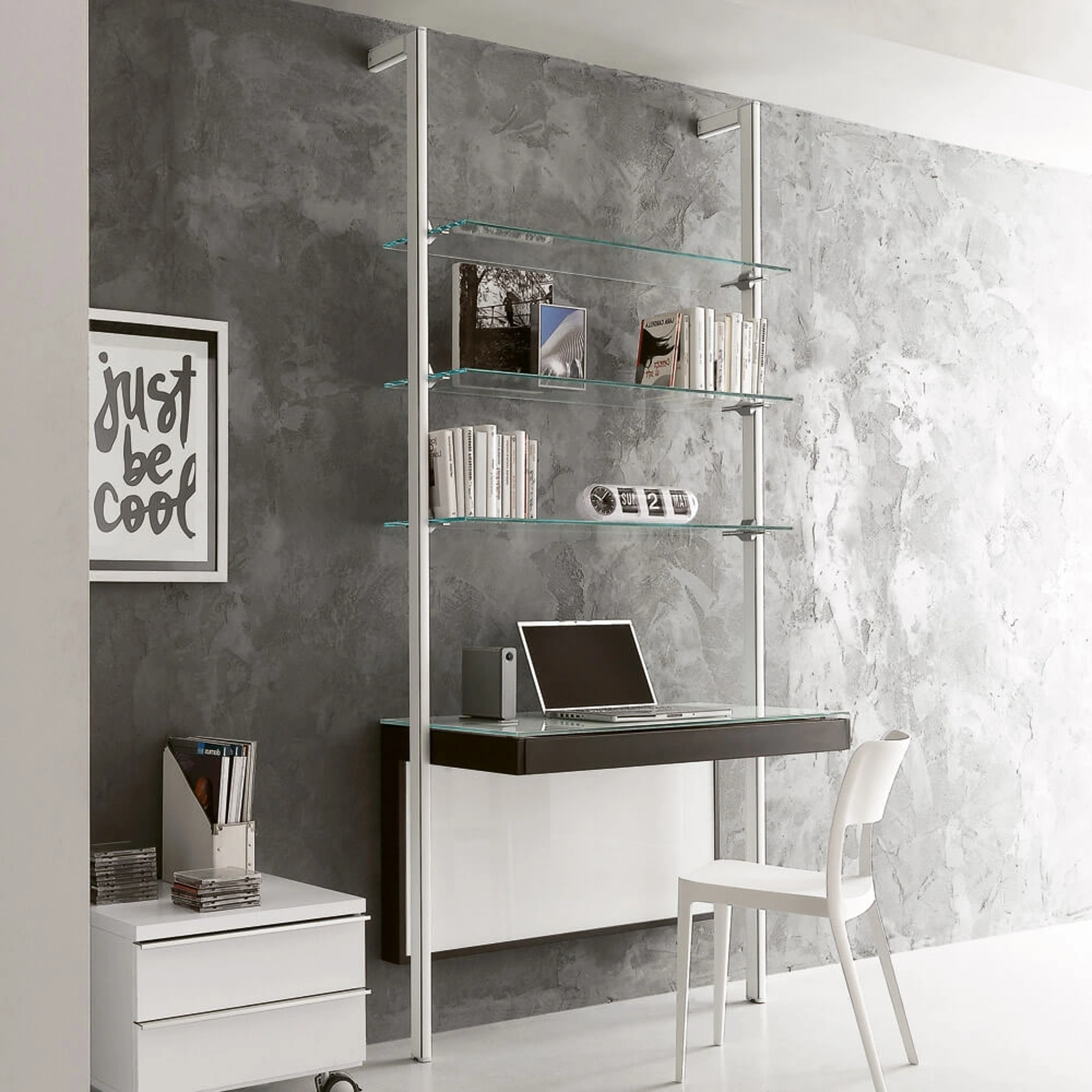 | Materiale: | Alluminio (montanti), Legno laccato (piani, contenitori), Melaminico (piani, contenitori), Cristallo (piani) |