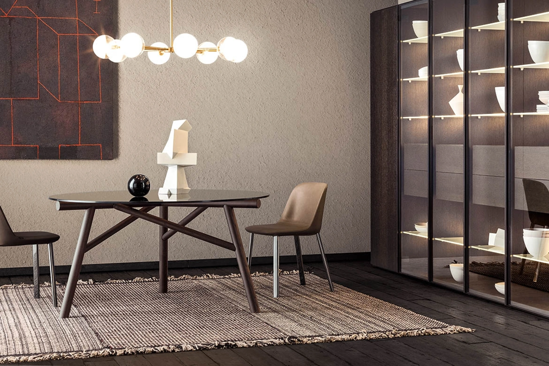 Il sistema di librerie modulari Spazioteca di Pianca incarna un'estetica raffinata e una funzionalità avanzata, pensata per organizzare lo spazio living con precisione. La sua architettura versatile consente configurazioni personalizzate attraverso fianchi, ripiani, schiene e divisori, garantendo un'integrazione fluida in qualsiasi ambiente. La variante 'Vetro' si distingue per l'impiego di ante a ribalta in vetro trasparente con una sofisticata cornice serigrafata nera, offrendo soluzioni espositive eleganti e la possibilità di integrare postazioni home office. Per approfondimenti sulle specifiche costruttive e sulle opzioni di finitura, la documentazione tecnica è consultabile su richiesta.