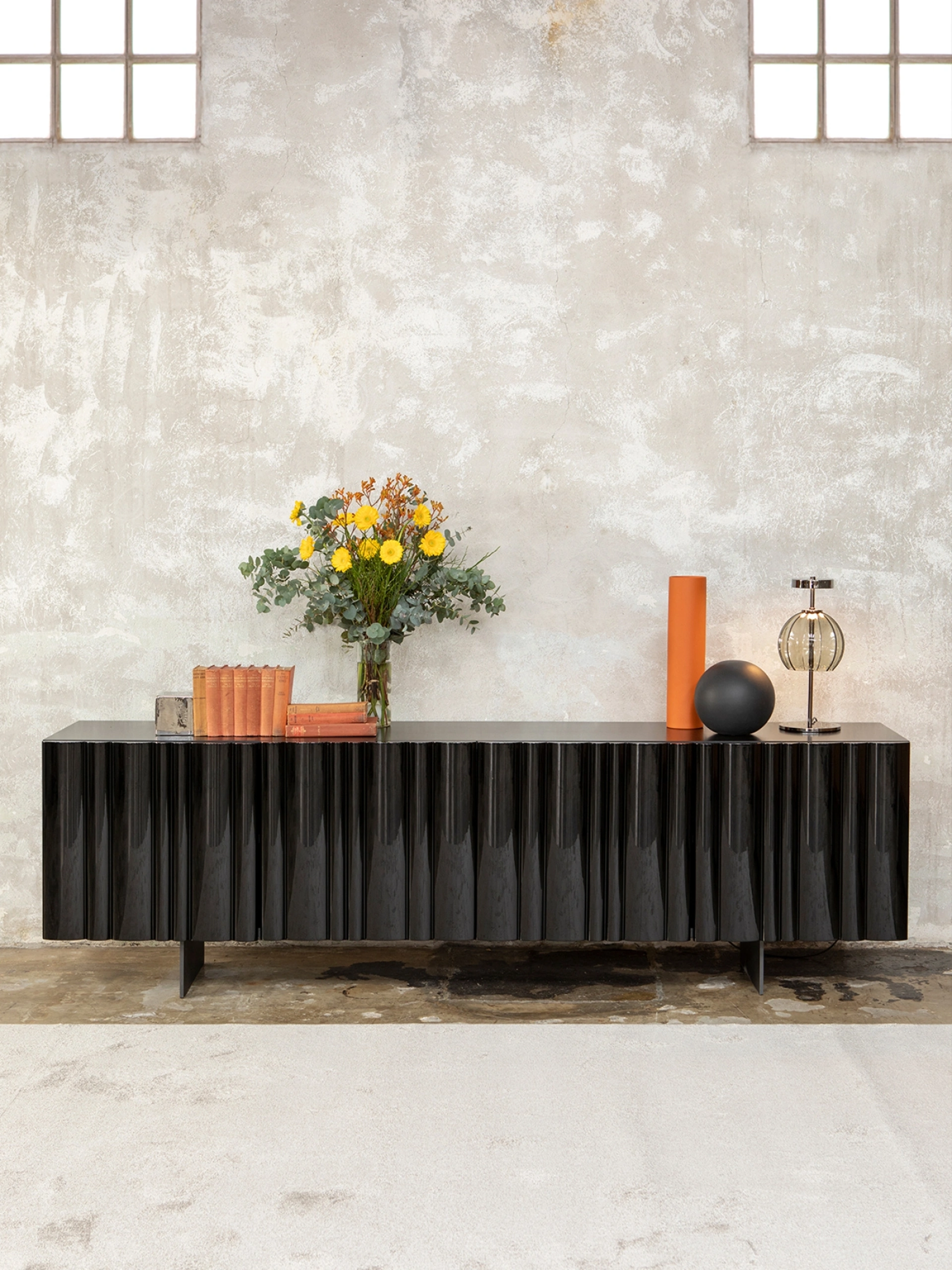 La splendida Madia Bombè di Tonin Casa è ora disponibile per la visione e l'acquisto presso il nostro showroom Rusconi Arredamenti s.r.l. a Cirimido. Questo esclusivo mobile contenitore, caratterizzato da un design contemporaneo e forme avvolgenti, è destinato a diventare il punto focale della vostra zona giorno. Realizzata con una base in legno laccato nero, presenta ante in MDF laccato nero lucido, disponibili in versioni a tre o quattro elementi, impreziosite da una lavorazione a doghe stondate e sostenute da eleganti piedini in metallo verniciato. Le opzioni di dimensione includono la configurazione a 3 ante (L 180 x P 45 x H 78 cm) e quella a 4 ante (L 240 x P 45 x H 78 cm), perfette per adattarsi al vostro ambiente. Le finiture delle ante, disponibili in Grigio Carbone o Bronzo Pietra, offrono ulteriori possibilità di personalizzazione, per un mobile che potrete apprezzare dal vivo nel nostro spazio espositivo. La nostra priorità è la vostra piena soddisfazione, per questo offriamo un servizio post-vendita dedicato e garanzie estese su tutti i prodotti Tonin Casa.