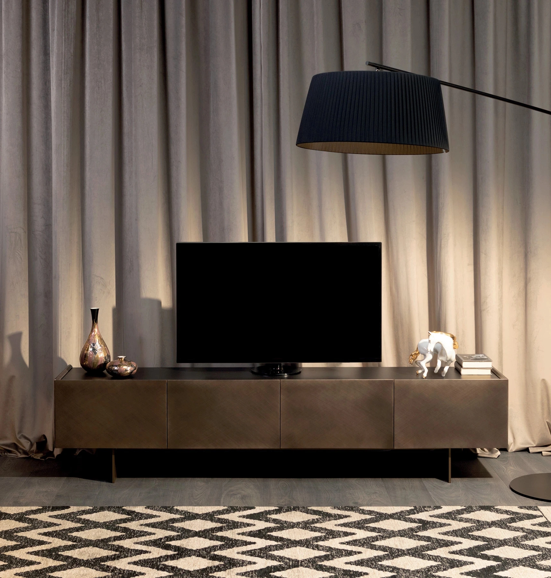 Il mobile contenitore Coated di Tonin Casa si distingue per la sua esclusiva finitura spazzolata, proposta nell'elegante tonalità bronzo, pensata per una perfetta integrazione estetica con gli altri elementi della collezione. La struttura interna è realizzata in legno di alta qualità, con configurazioni a tre o quattro ante laccate, garantendo robustezza e funzionalità. La base, in metallo verniciato bronzo pietra, assicura stabilità e un design raffinato. Un top opzionale in vetro retroverniciato nero arricchisce ulteriormente le possibilità di personalizzazione. Le varianti dimensionali includono una versione a 3 ante (L 180 x H 75 x P 45 cm) e una a 4 ante (L 240 x H 75 x P 45 cm), entrambe progettate per ottimizzare lo spazio e l'estetica. L'attenzione ai dettagli costruttivi e la selezione di materiali durevoli garantiscono un prodotto di eccellente qualità e longevità.