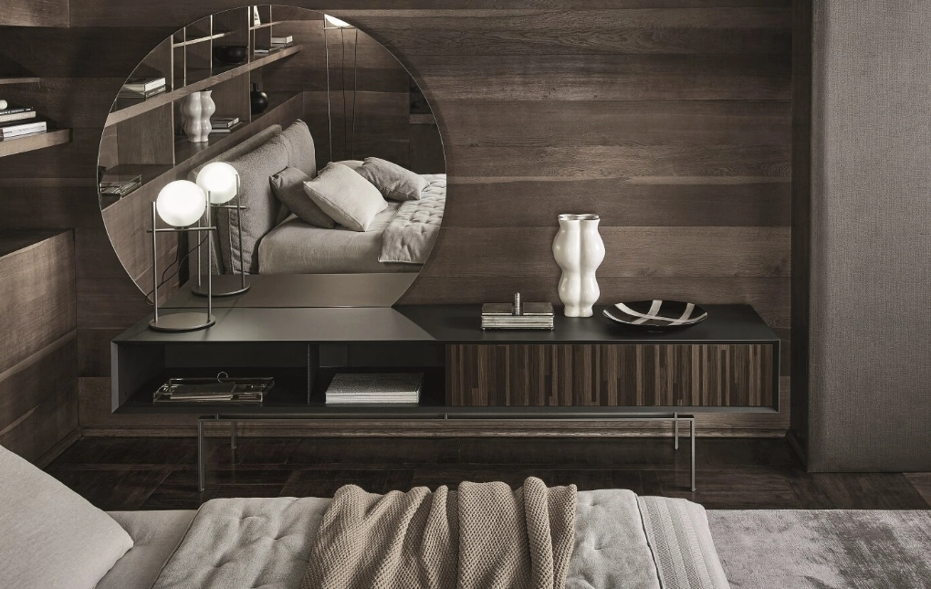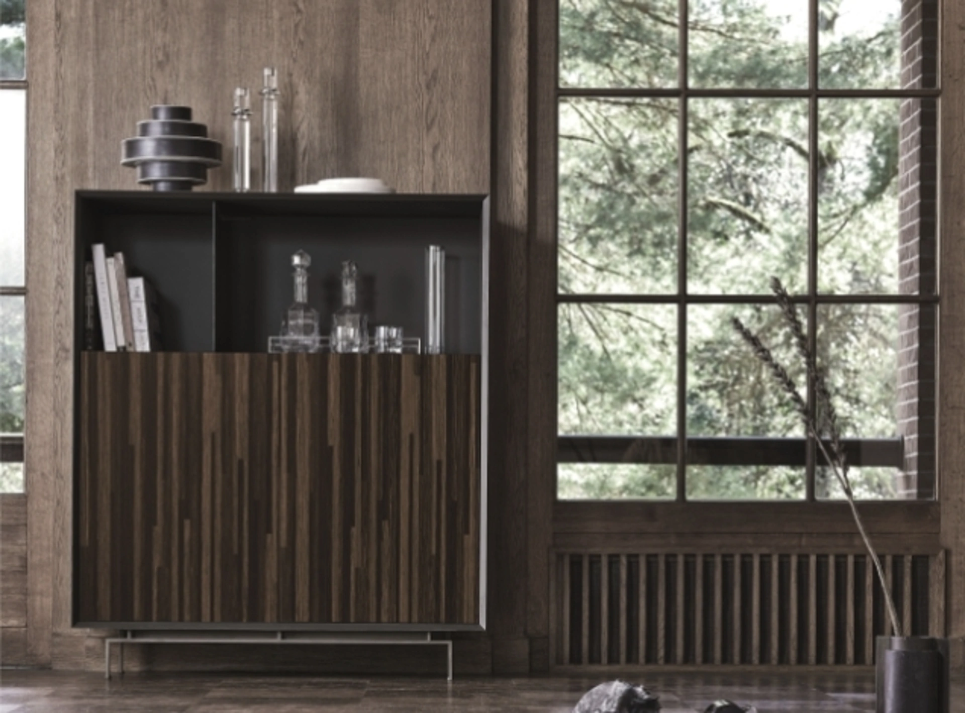| Materiale: | Legno tinto, Metallo (base), Laccato (struttura antracite), Legno impiallacciato (frontali), Cuoio grigio (separé cassetti, se presente) |